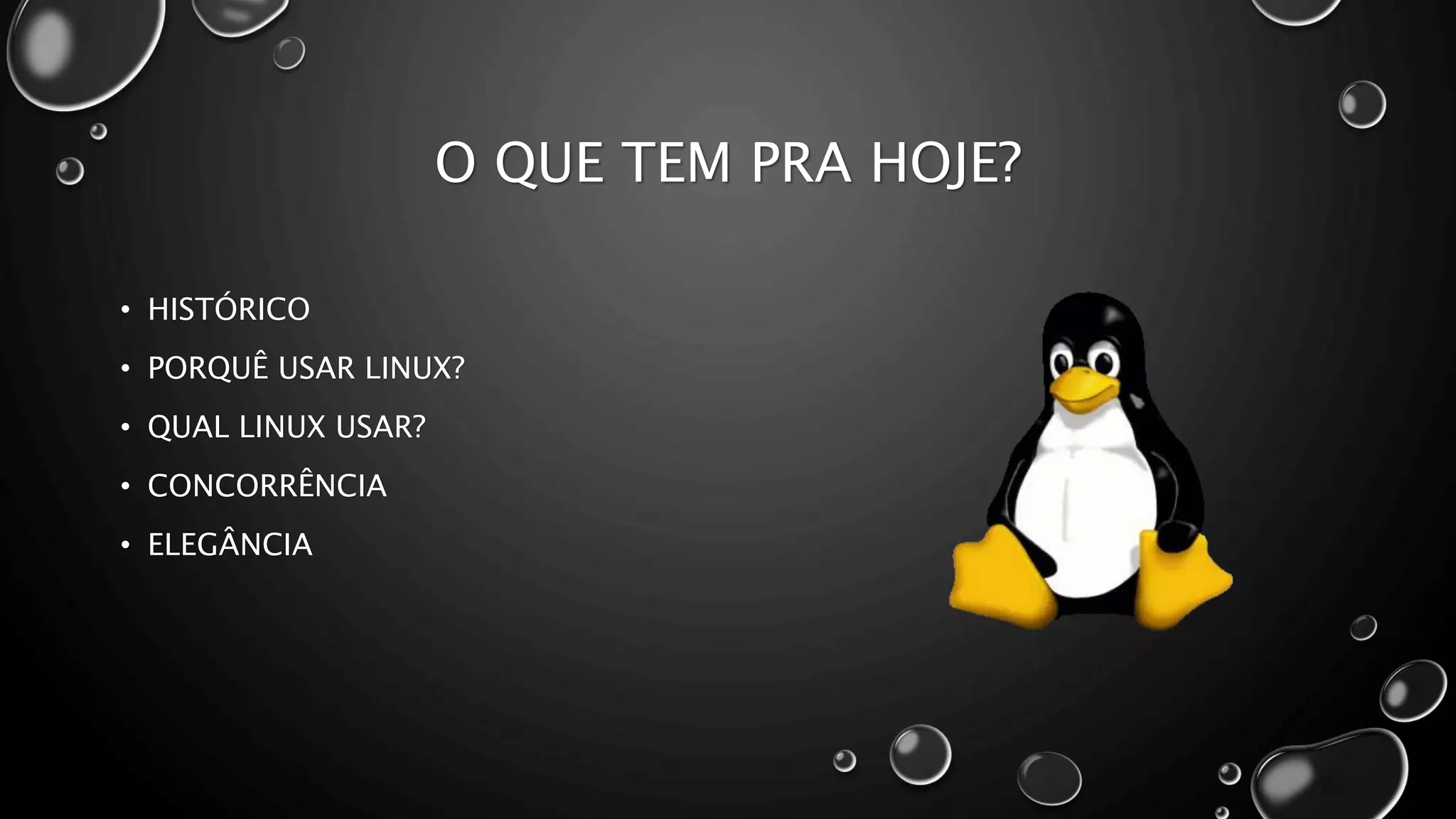 O documento discute a história do Linux, as razões para usar Linux no PC, as principais distribuições e ambientes gráficos disponíveis, e como personalizar a aparência e funcionalidade do Linux para aumentar a produtividade e elegância do sistema. O foco é fornecer uma visão geral do Linux para usuários iniciantes a avançados.