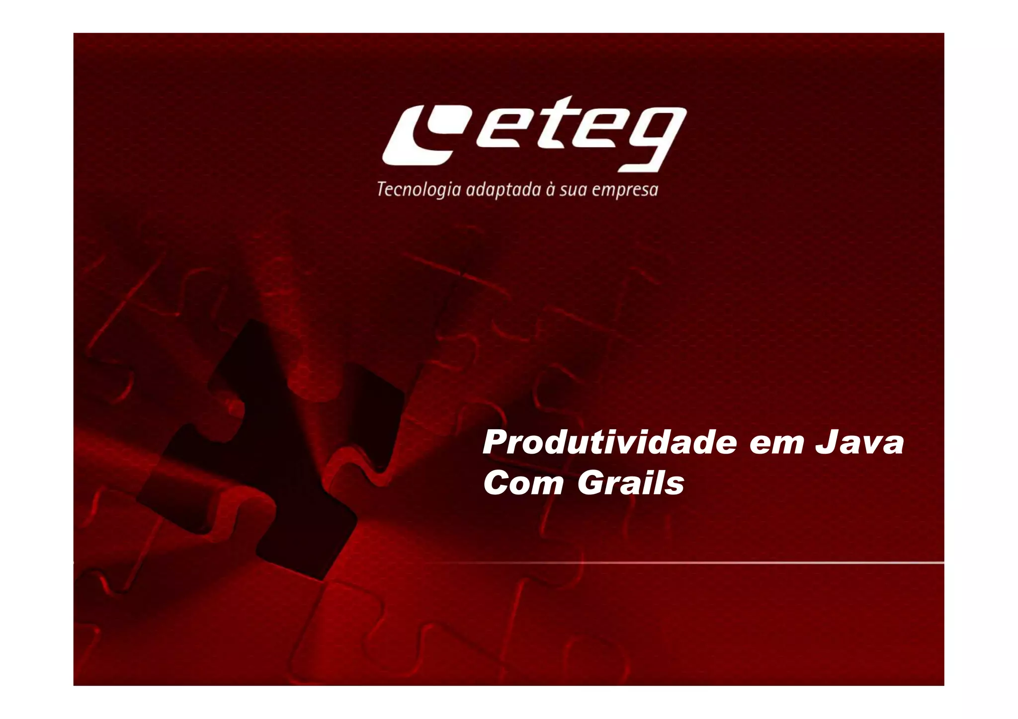 O documento apresenta a framework Grails como uma evolução da plataforma Java que eleva a produtividade com menor risco e está pronta para computação em nuvem. Grails é baseada em Groovy e traz recursos de linguagens como Ruby e Python para Java, removendo configurações complexas. Exemplos mostram como Grails simplifica tarefas como modelagem de dados, consultas e visões em comparação com frameworks Java tradicionais.