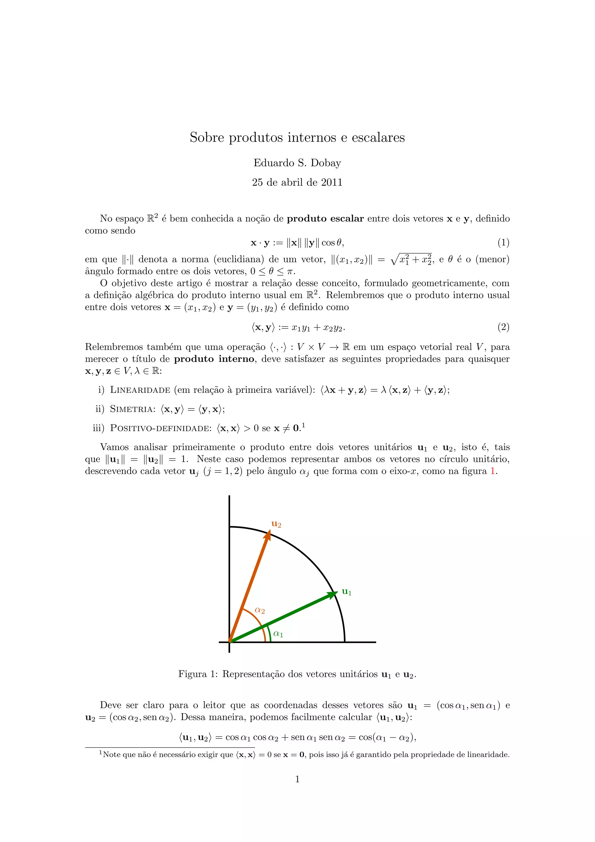 1) O documento discute a relação entre o produto escalar e o produto interno usual em R2.
