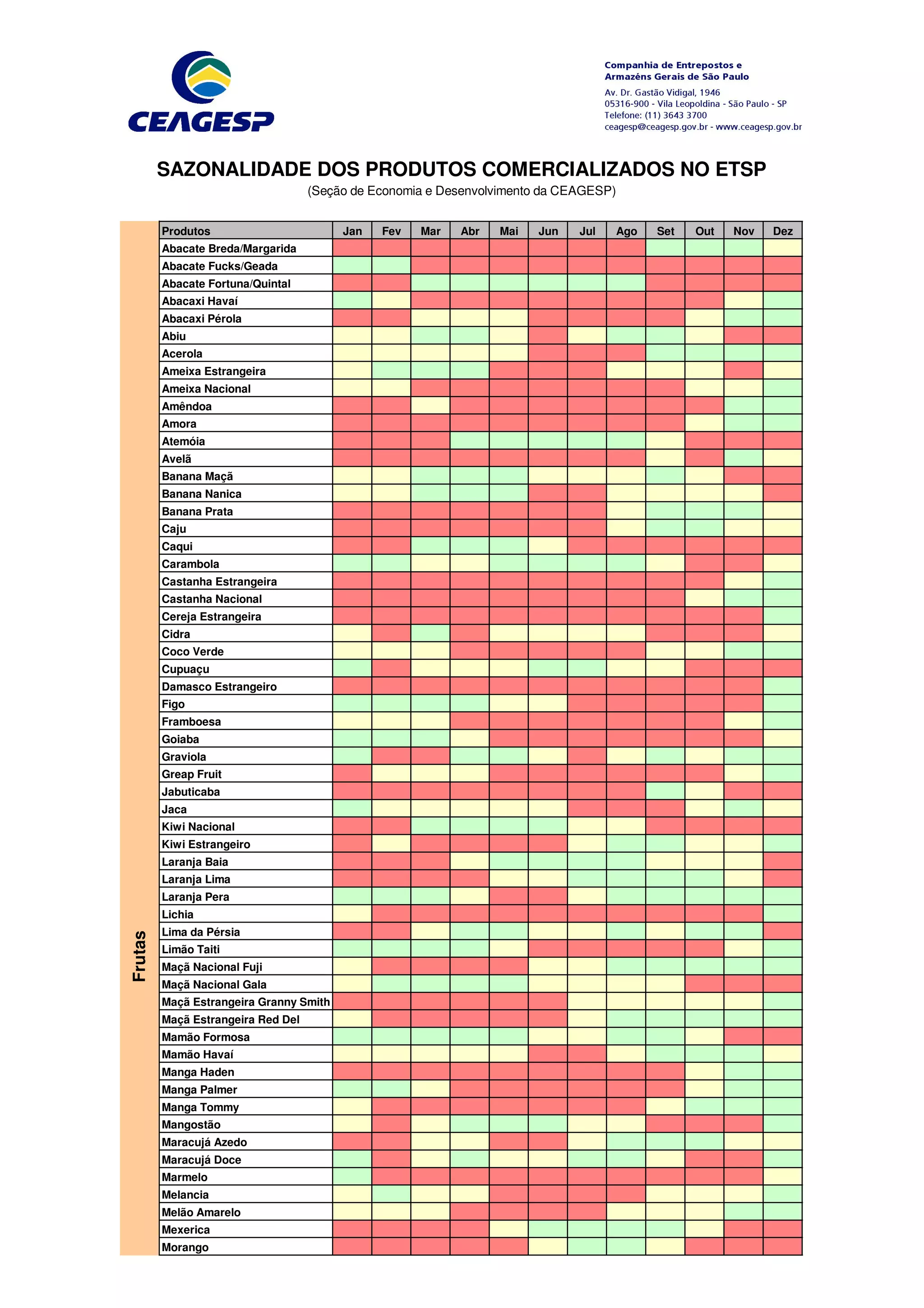 O documento lista os produtos comercializados no CEAGESP e indica sua sazonalidade ao longo do ano, divididos em frutas, legumes, verduras, flores e pescados. A sazonalidade varia entre fraca, média e forte ao longo dos meses do ano.