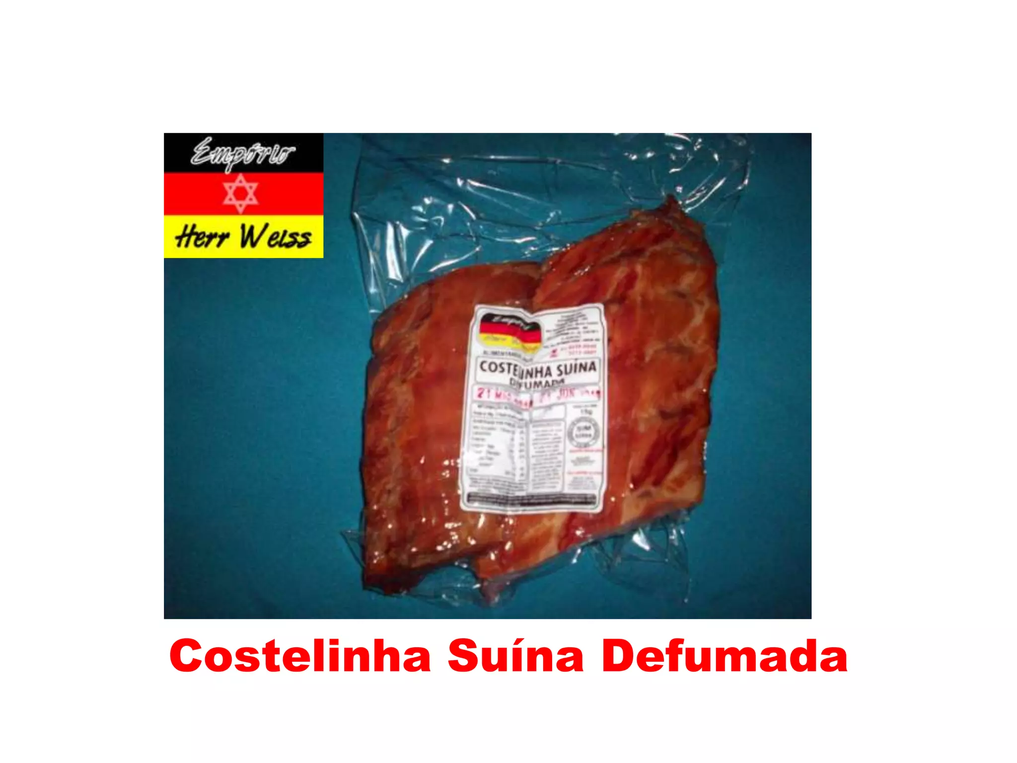 O documento lista vários tipos de carnes suínas e bovinas defumadas, com ênfase nas costelinhas suínas defumadas, mencionadas seis vezes, e também lista cupim, galeto, picanha e copa do lombo defumados.