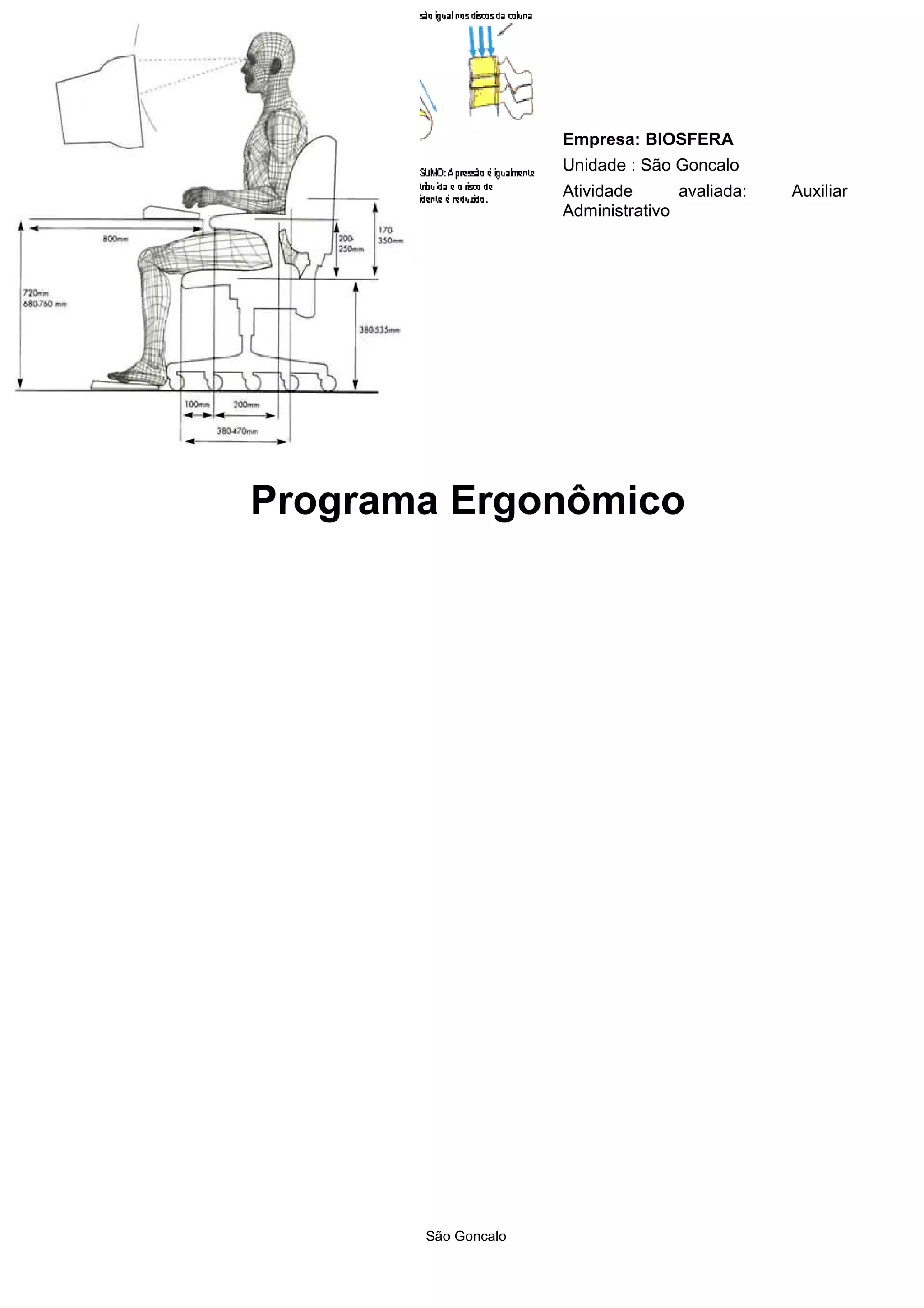 Este documento descreve o Programa Ergonômico da empresa Biosfera na unidade de São Goncalo para avaliar e melhorar as condições de trabalho do auxiliar administrativo. O programa tem como objetivos prevenir doenças ocupacionais e promover a saúde dos trabalhadores, focando em ergonomia, mobiliário, iluminação e ruído no ambiente de trabalho. Ele define responsabilidades, atividades, treinamentos e um cronograma de ações para implementação.