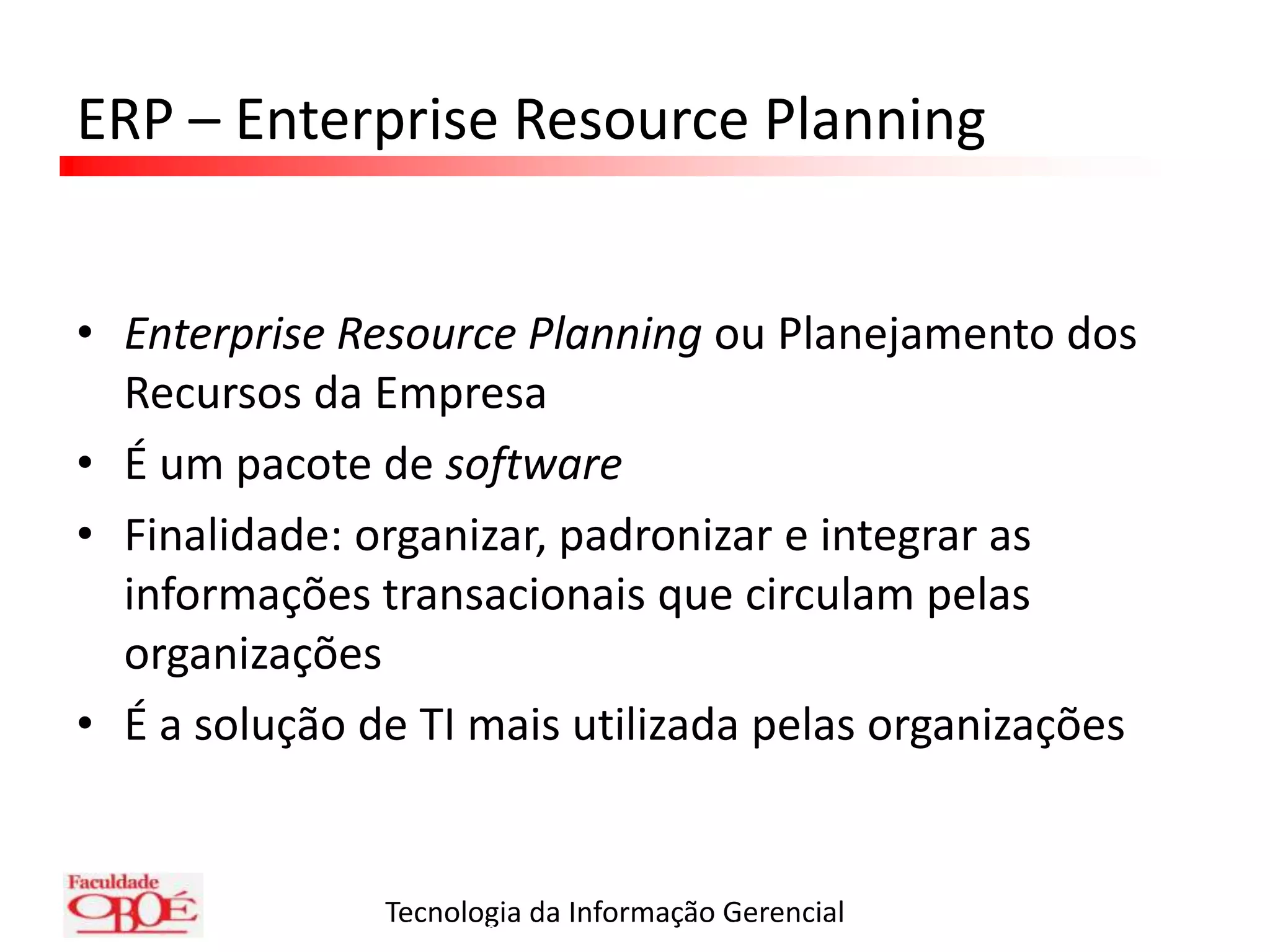 Um ERP é um sistema de software que integra processos de negócios de uma organização. Um ERP permite acesso a informações confiáveis em tempo real e integra todas as áreas e processos da empresa. Implementar um ERP pode trazer benefícios como redução de custos e melhoria da eficiência, mas também há desvantagens como alta dependência do fornecedor e custos elevados.