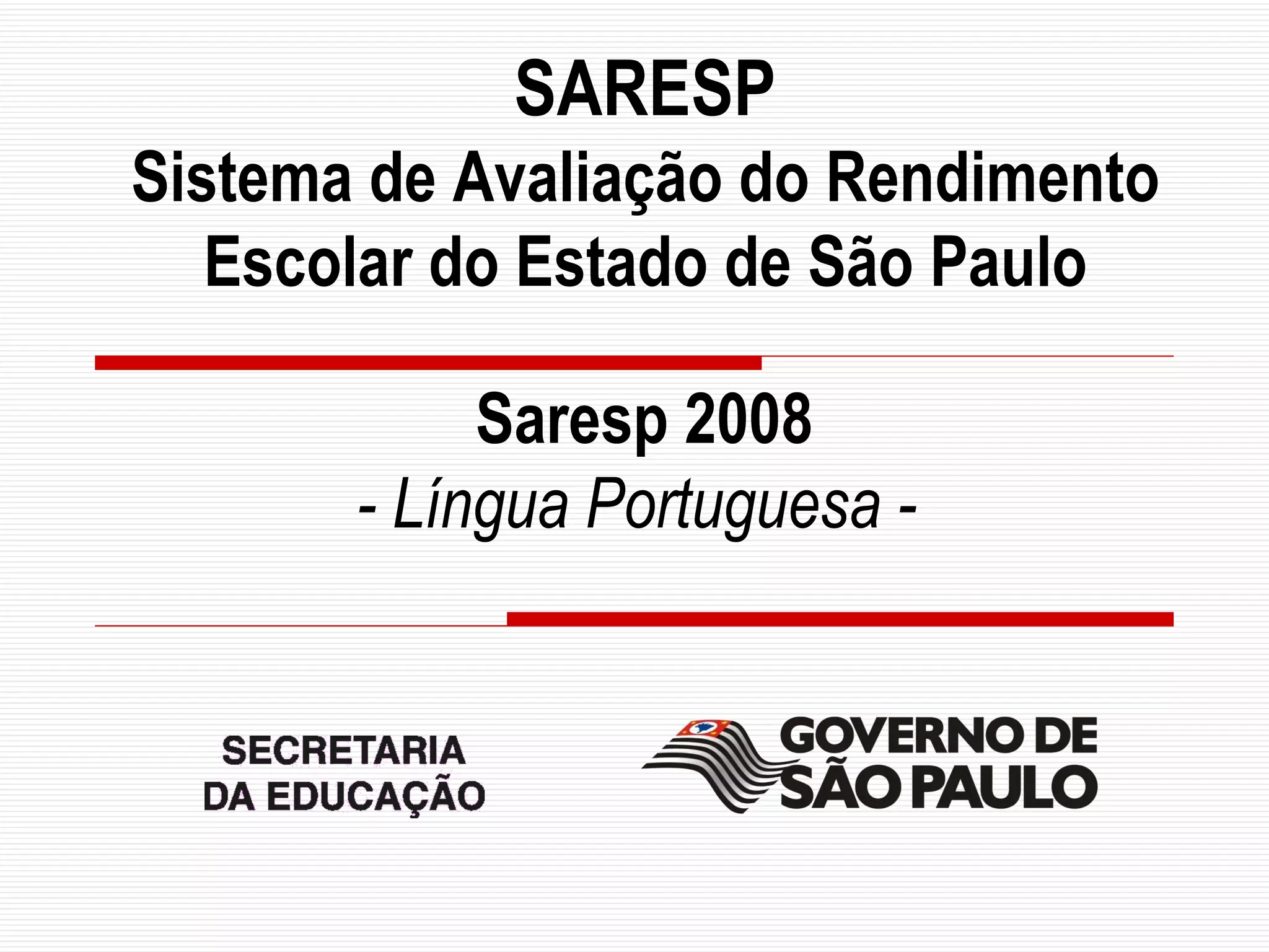 O documento apresenta informações sobre o SARESP (Sistema de Avaliação do Rendimento Escolar do Estado de São Paulo), incluindo seus pressupostos, materiais de apoio e análises qualitativas e quantitativas dos resultados das avaliações. É destacado que o SARESP produz indicadores para diagnosticar o sistema educacional e gerar estratégias de melhoria, e que as escolas recebem boletins com seus resultados específicos para analisar a qualidade do ensino oferecido.