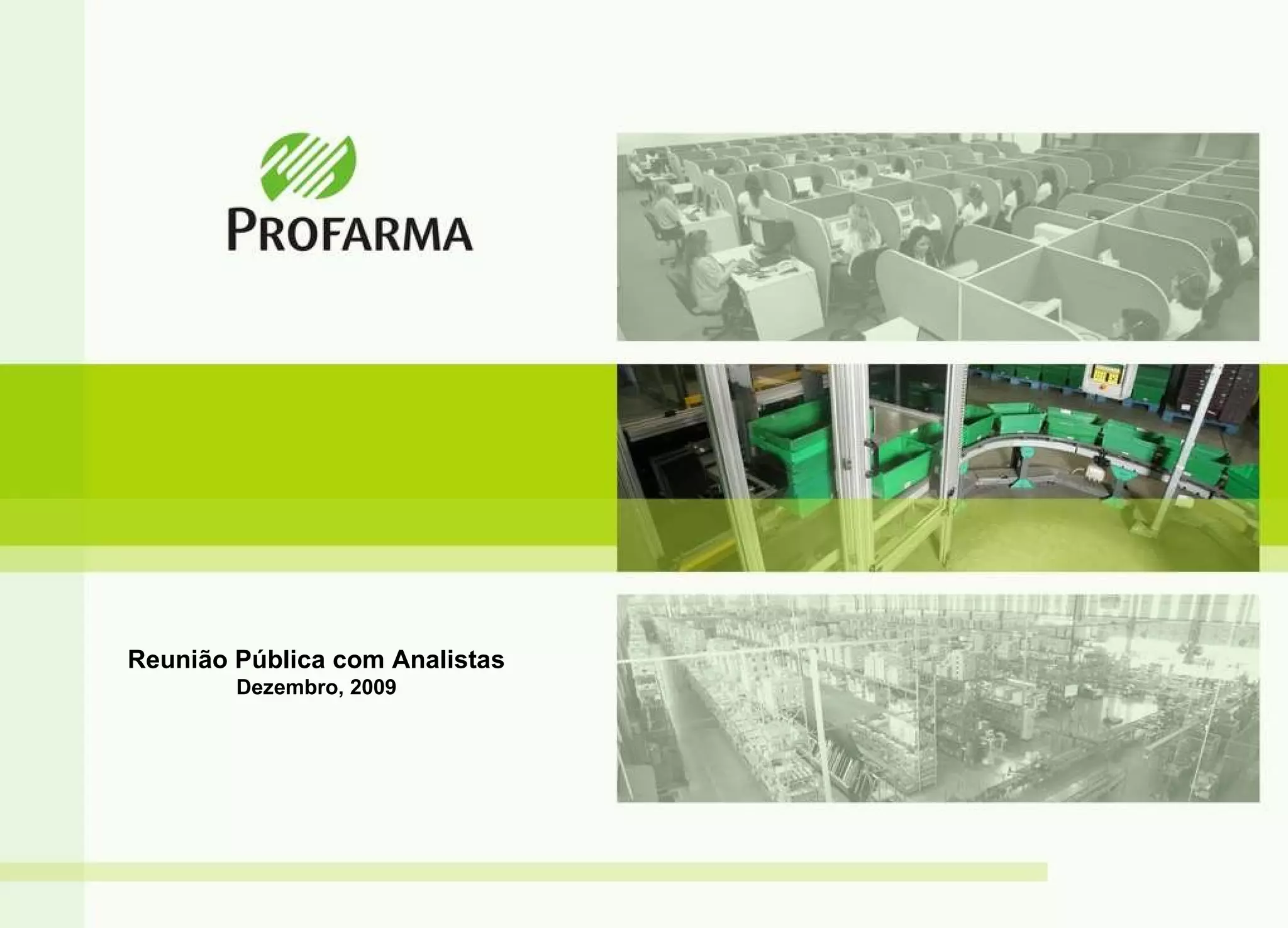 A reunião discutiu a Profarma, distribuidora líder no Brasil com 12% de market share. A Profarma cresceu a uma taxa média anual de 20% entre 2004-2008, acima do mercado de 12%. O mercado farmacêutico brasileiro cresceu 12,5% em 2008 e tem potencial para crescer 7-10% ao ano até 2013 devido ao envelhecimento da população.