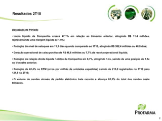 (1) O lucro líquido da Companhia cresceu 47,1% no segundo trimestre, atingindo R$11,4 milhões. (2) As despesas operacionais caíram para 53,8 milhões ou 8,9% da receita líquida no segundo trimestre. (3) A geração de caixa operacional foi positiva de R$46,8 milhões ou 7,7% da receita líquida no segundo trimestre.