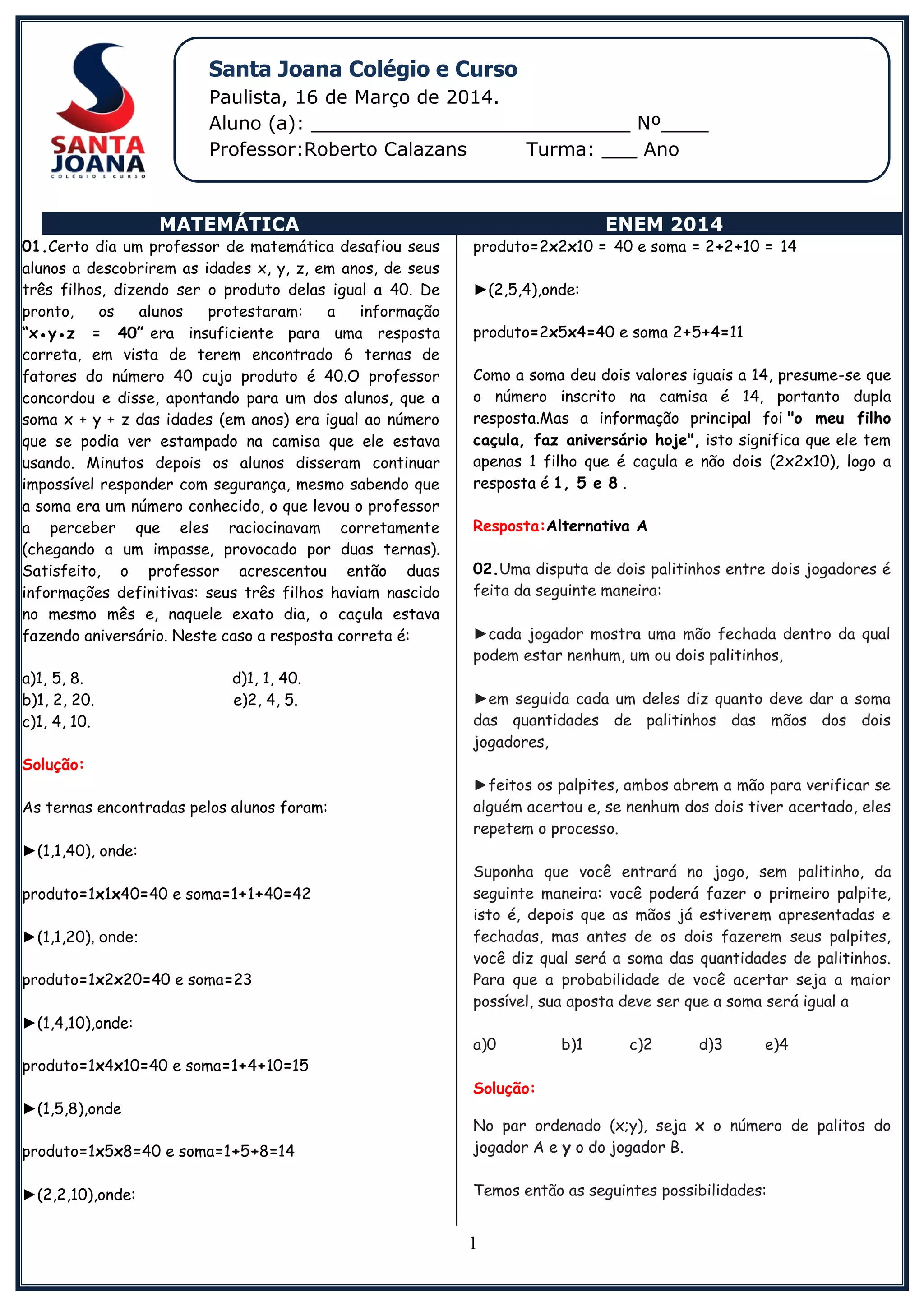 alunos a descobrirem as idades x, y, z, em anos, de seus