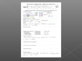 O documento descreve a evolução do uso da sala de informática e dos cursos de tecnologia em uma escola ao longo dos anos, desde os desafios iniciais com equipamentos lentos e problemas de conexão até conquistas como prêmios em concursos e alunos que encontraram emprego na área. Relatos de alunos, professores e funcionários demonstram os benefícios dos cursos para a pesquisa escolar e futuro profissional. Novos equipamentos doados e melhoria na internet são esperados para aumentar a participação nos cursos.