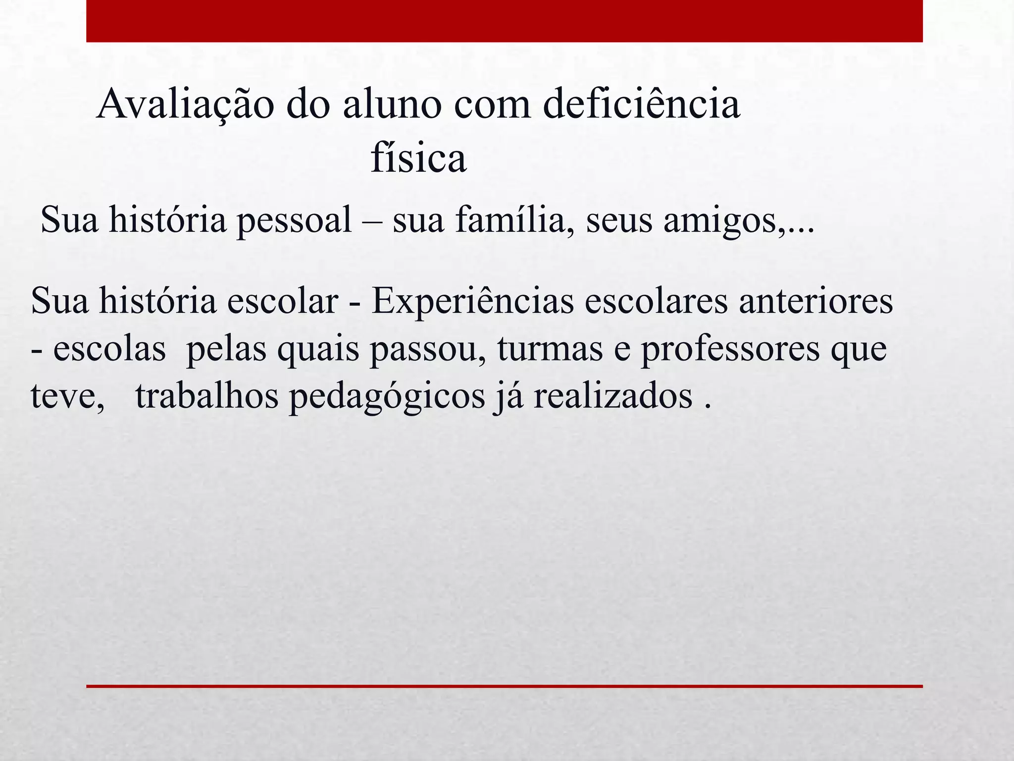 O documento discute a avaliação de um aluno com deficiência física, destacando a importância de avaliar suas necessidades educacionais, histórico escolar, habilidades de leitura, escrita e interação, além de níveis de conhecimento, para desenvolver um plano educacional adequado.