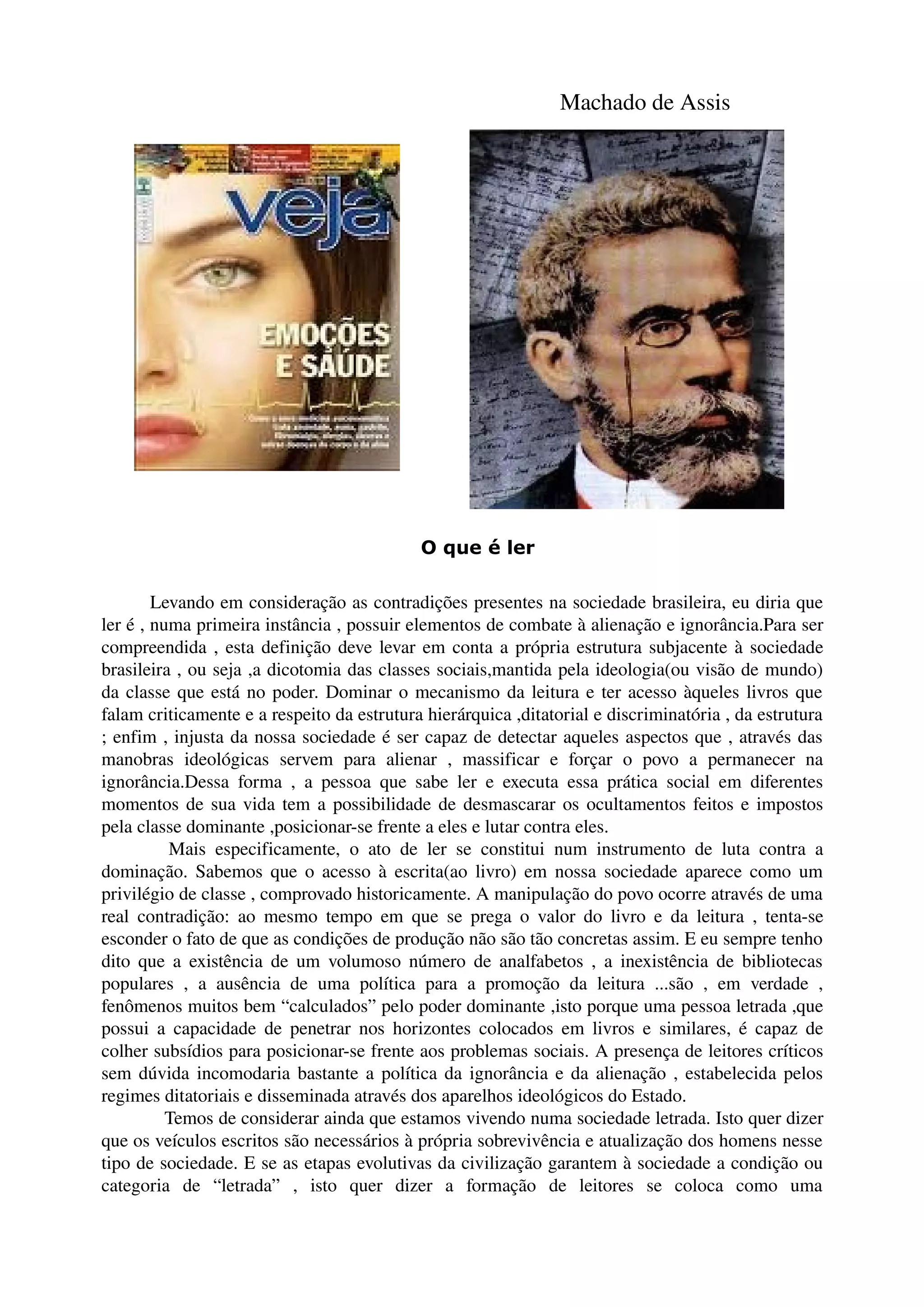 1) Ler é um direito de todos e um instrumento para combater a alienação e ignorância, especialmente na sociedade brasileira marcada por desigualdades de classe.