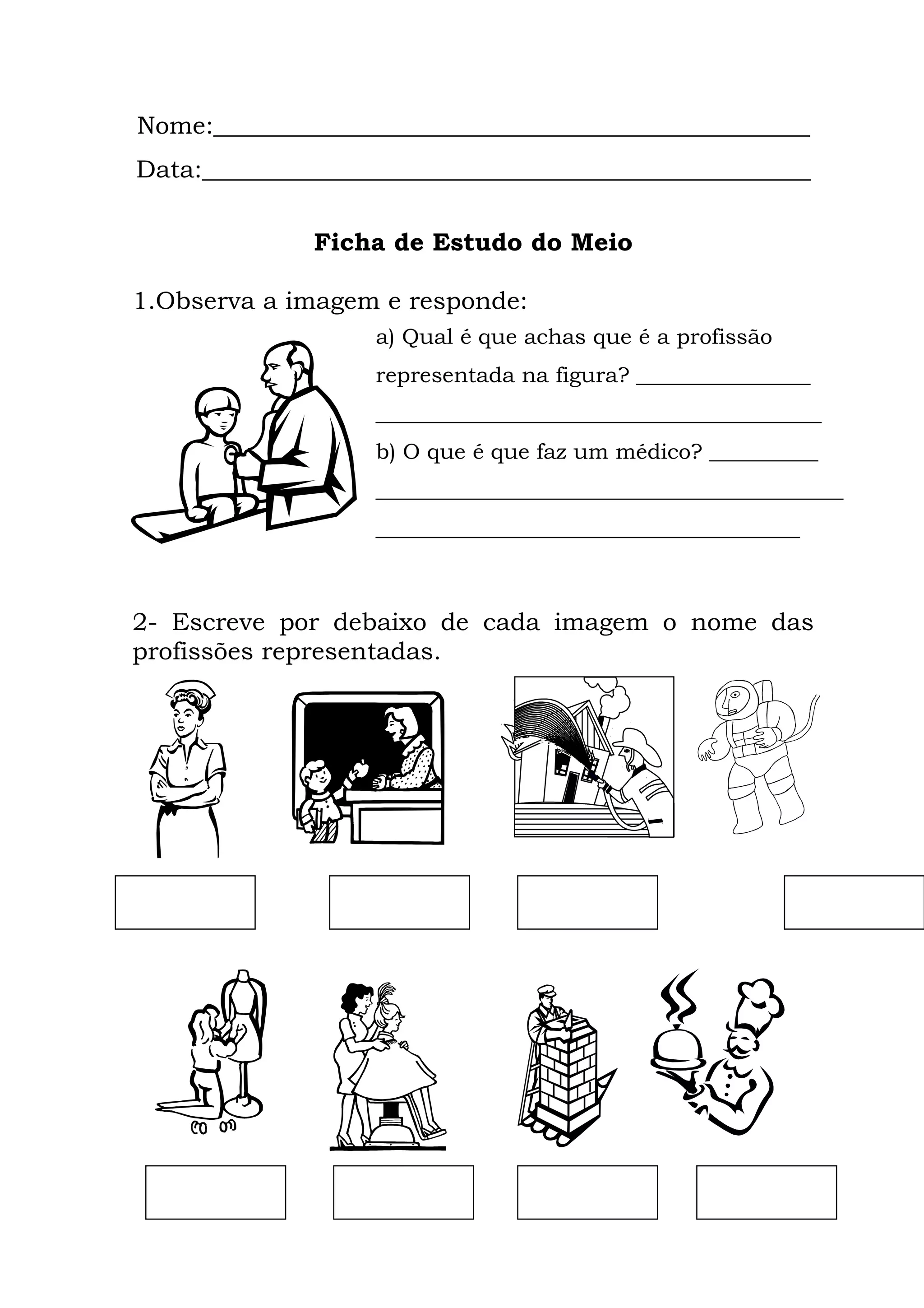 Este documento fornece instruções para preencher uma ficha de estudo do meio com perguntas sobre profissões, sinais de trânsito e cores. As crianças devem identificar imagens de profissões, nomear sinais de trânsito, colorir sinais e completar frases sobre atravessar na passadeira.