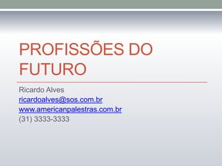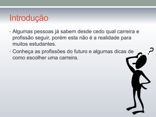 O documento discute profissões do futuro e dicas para escolher uma carreira. Ele identifica as áreas de tecnologia, meio ambiente, medicina e educação como tendo maior potencial de crescimento e fornece exemplos de carreiras nessas áreas, além de dicas como avaliar habilidades e conversar com profissionais.