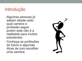 O documento discute profissões do futuro e áreas com alto potencial de crescimento, incluindo tecnologia, meio ambiente, medicina e educação. Ele fornece descrições de carreiras nessas áreas, como engenheiro da computação, biólogo e professor, além de exemplos de onde trabalhar. Gráficos mostram a faixa salarial dessas profissões. A conclusão enfatiza encontrar felicidade fazendo o que se gosta.