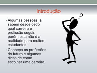 O documento discute as profissões do futuro nas áreas de tecnologia, meio ambiente, medicina e educação. Ele fornece exemplos de carreiras em cada área e suas principais áreas de atuação, além de dar dicas sobre como escolher a profissão certa.