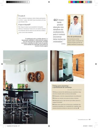 O documento descreve a parceria de sucesso de 10 anos entre as arquitetas Luciana Corrêa e Elaine Delegredo e o gesseiro José Maria Andrade. O gesseiro se destaca por cumprir prazos, ter serviço limpo e organizado, e oferecer qualidade e preço justo. A boa comunicação entre as partes é essencial para garantir qualidade na execução dos projetos. O trabalho do gesseiro no apartamento de 130m2 custou R$5.000 e levou 20 dias para ser concluído.