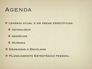O documento discute as demandas e escolhas enfrentadas por profissionais de TI no futuro. Apresenta como a área de tecnologia, negócios e aspectos humanos estão em constante mudança e exigem aprendizado contínuo, habilidades comportamentais e alinhamento com a estratégia de negócios. Também ressalta a importância de planejamento pessoal com definição de propósito, valores e metas para nortear as escolhas dos profissionais de TI.