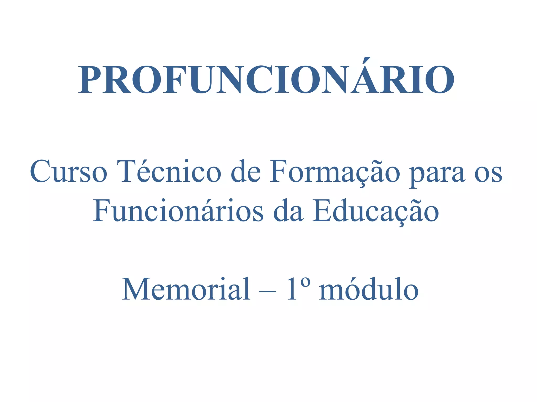 O documento discute a importância do curso Profuncionário para a profissionalização de funcionários da educação. Ele destaca que o curso visa construir a identidade profissional de funcionários com formação de nível médio e que é importante para que eles desempenhem melhor suas funções como educadores, não apenas funcionários. O documento também observa diferenças entre escolas em áreas centrais e periféricas.