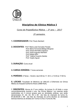 Este documento descreve o programa da disciplina de Clínica Médica I para o 3o ano do curso de Medicina em 2017. O curso será ministrado duas vezes por semana com aulas teóricas e práticas cobrindo tópicos de semiologia médica. Será avaliado por provas teóricas e práticas ao longo do semestre.