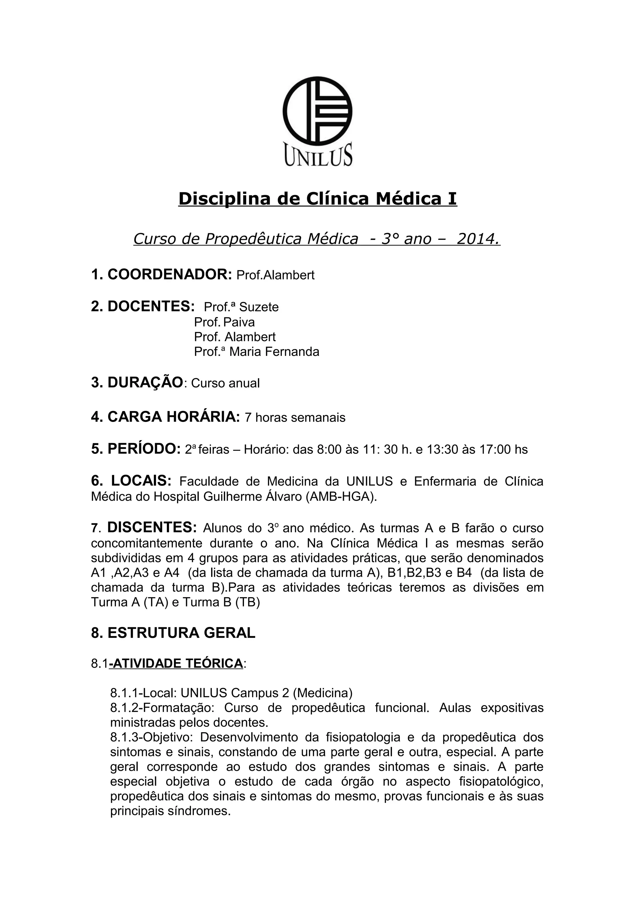 Este documento descreve o curso de Clínica Médica I para alunos do 3o ano de medicina, incluindo professores, duração, horários, locais, alunos, estrutura de atividades teóricas e práticas, avaliação e programa do 1o semestre.
