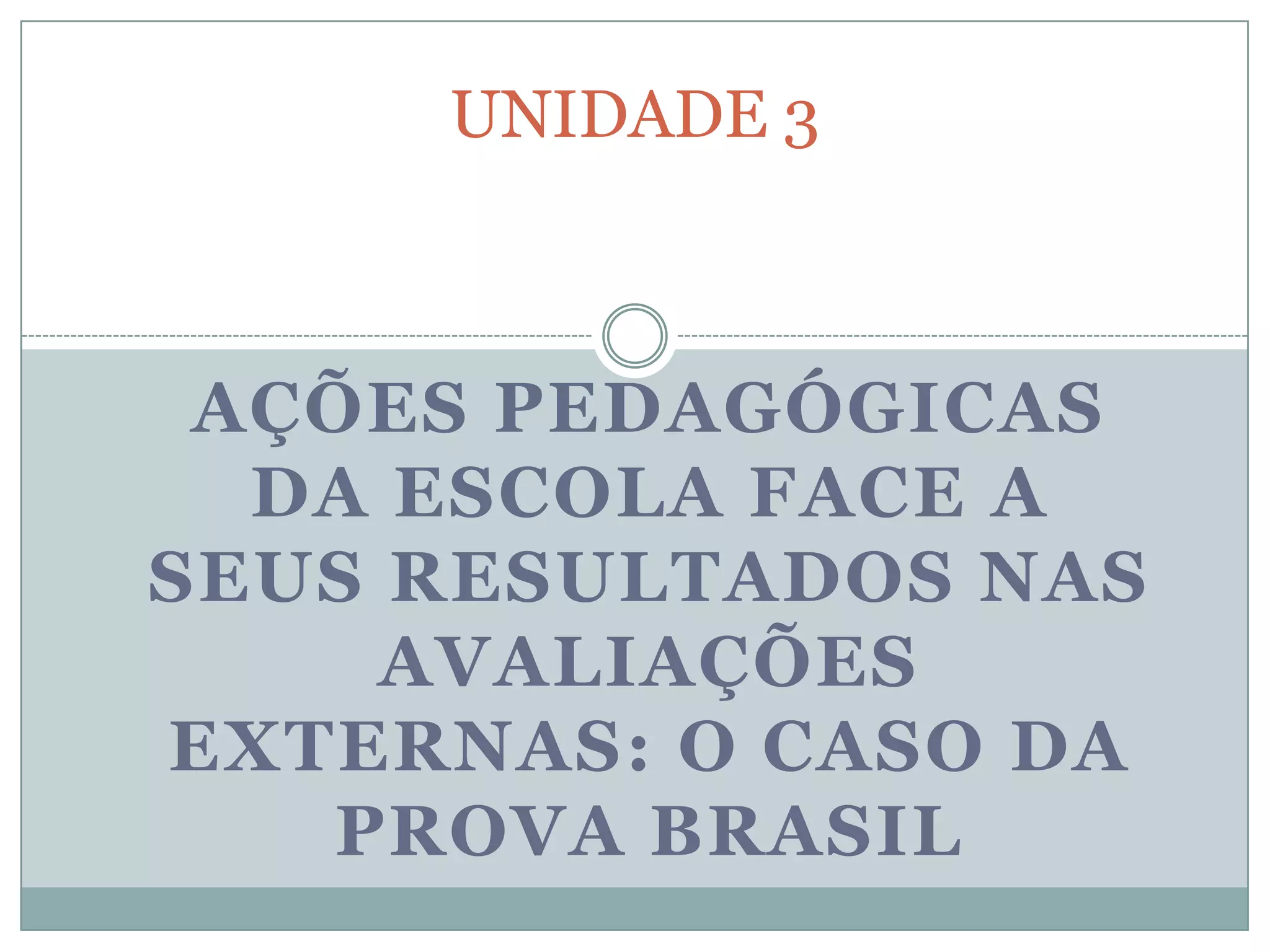O documento discute as avaliações externas aplicadas às escolas brasileiras, como o SAEB e a Prova Brasil. A Prova Brasil avalia especificamente cada escola e permite um diagnóstico da realidade de cada uma. Os resultados devem ser usados pelas escolas para gerar diagnósticos sobre o que os alunos aprenderam e para apoiar o desenvolvimento de competências.