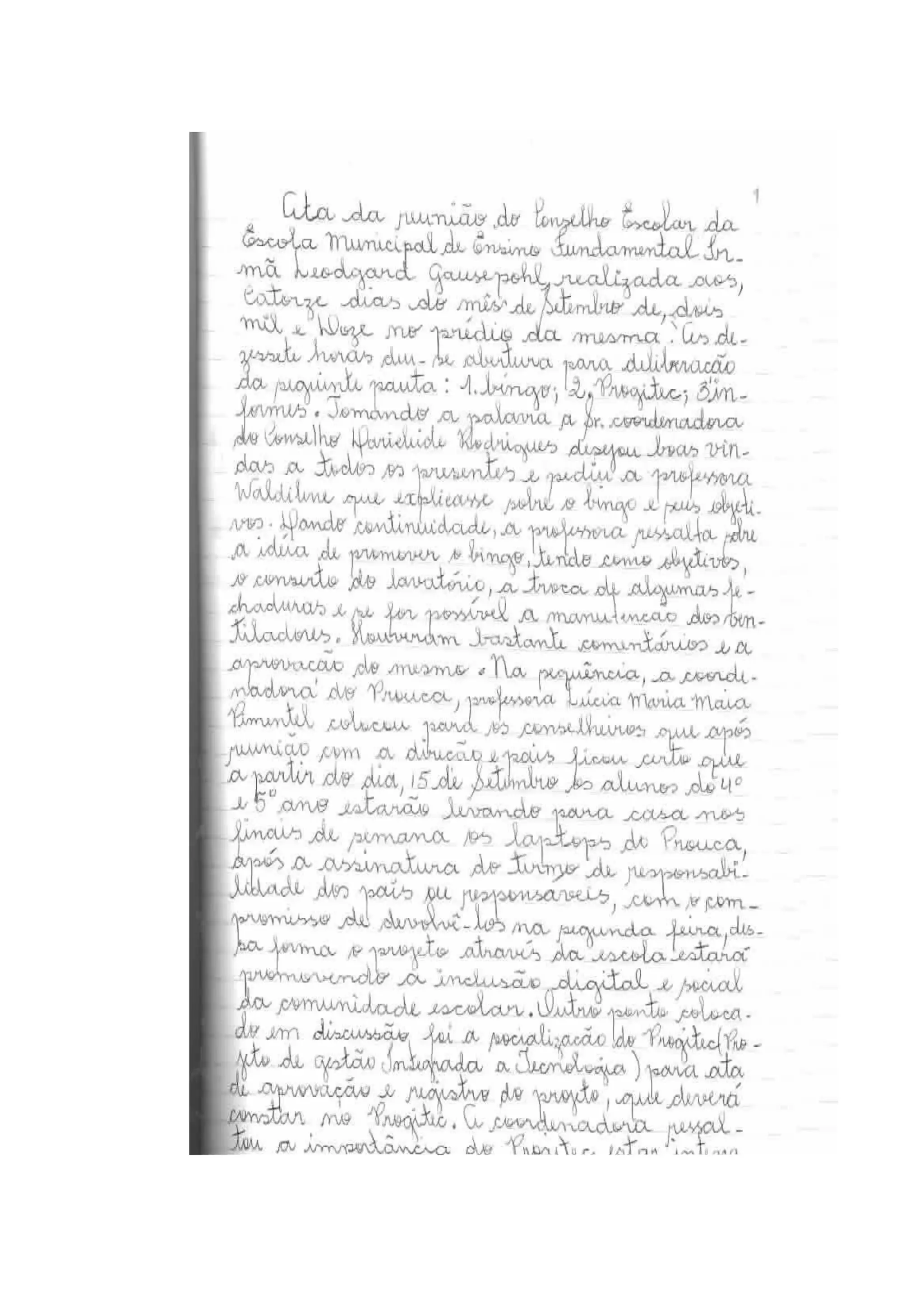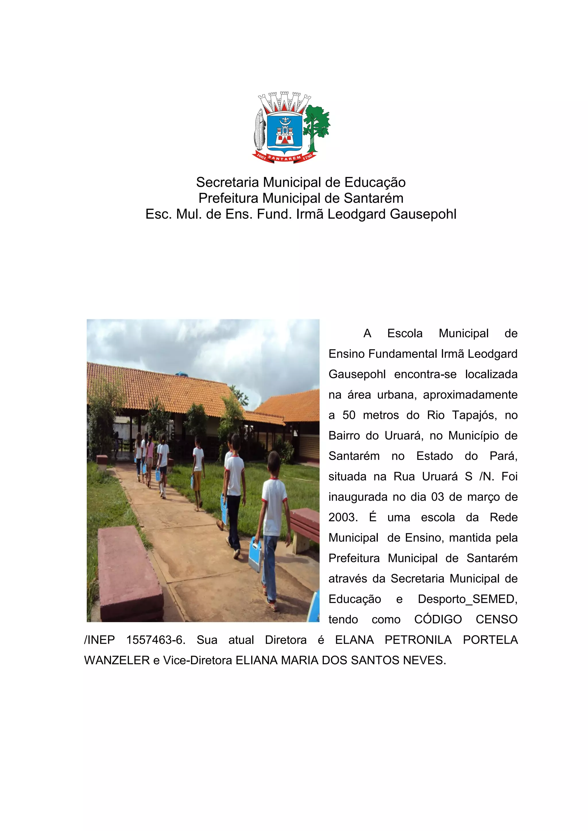 O documento descreve o projeto Progitec da Escola Municipal de Ensino Fundamental Irmã Leodgard Gausepohl em Santarém, Pará, focando na integração de tecnologias à prática pedagógica através do uso de laptops educacionais. O objetivo é promover a cultura digital e o desenvolvimento de competências em alunos e professores, utilizando recursos como o Programa Um Computador por Aluno (UCA) e metodologias interativas. Além disso, a escola possui uma infraestrutura adequada e uma equipe pedagógica que busca incentivar a leitura e escrita entre os alunos.