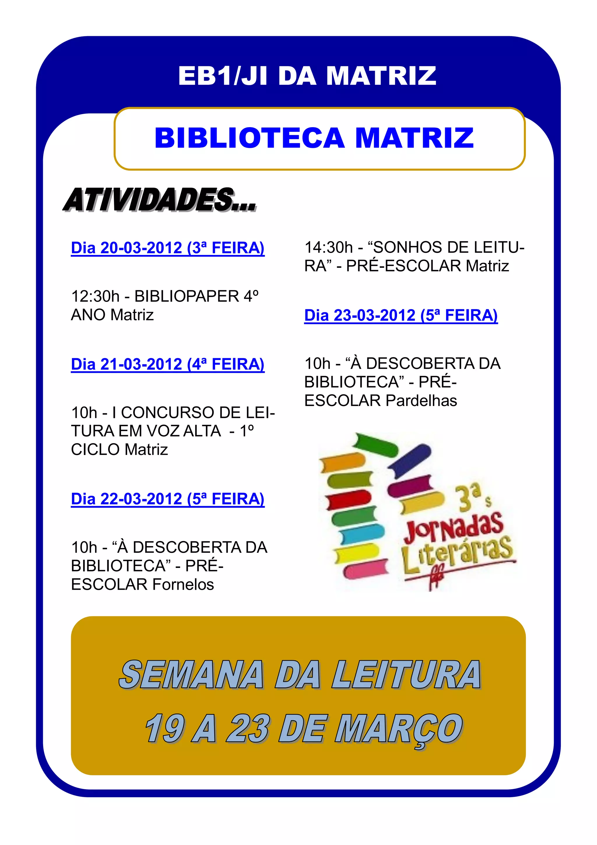 O documento lista atividades na biblioteca da escola matriz em três dias da semana, incluindo sessões de leitura para pré-escolar e concurso de leitura em voz alta para alunos do 1o ciclo.