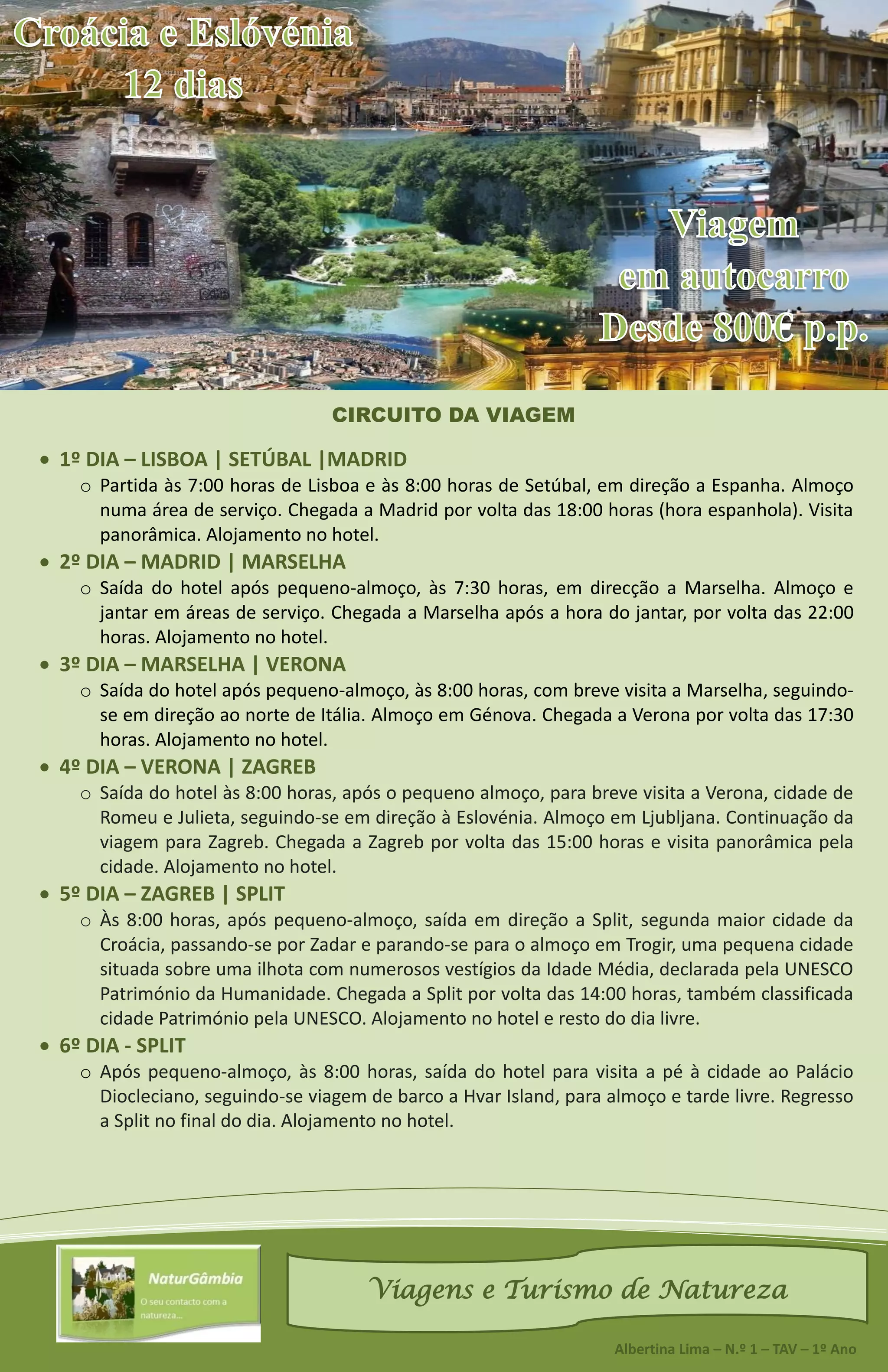 Este documento descreve um circuito de 12 dias que inclui viagens entre Lisboa, Espanha, França, Itália, Eslovénia, Croácia, Bósnia e Herzegovina, Montenegro e Barcelona. O itinerário inclui visitas a cidades como Madrid, Marselha, Verona, Zagreb, Split, Dubrovnik, Trieste e Barcelona, com alojamento e alimentação incluídos.