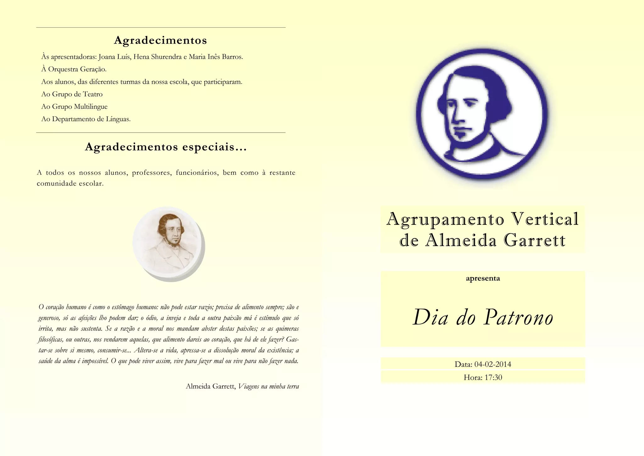O documento apresenta o programa de um evento realizado pelo Agrupamento Vertical de Almeida Garrett para comemorar o Dia do Patrono, Almeida Garrett. O programa incluiu momentos musicais interpretados pela Orquestra Geração e alunos, dramatizações e atribuição de certificados de mérito acadêmico e desportivo.