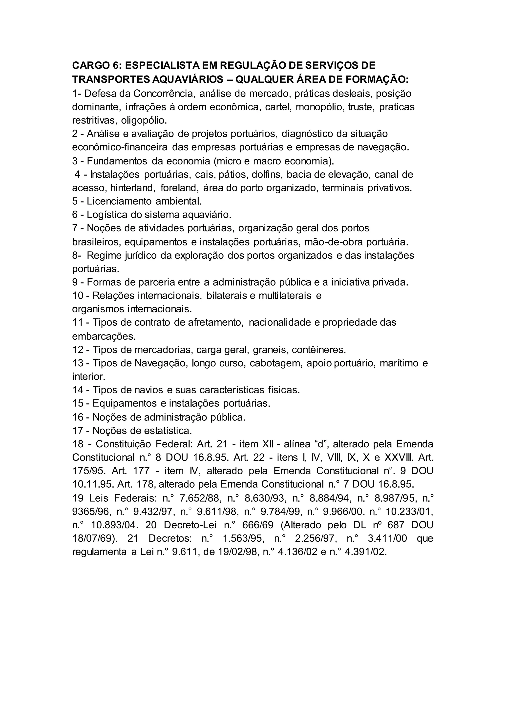 Este cargo exige conhecimentos em regulação de serviços de transportes aquaviários, análise de projetos portuários, fundamentos de economia e direito relacionados a portos e transporte aquaviário.