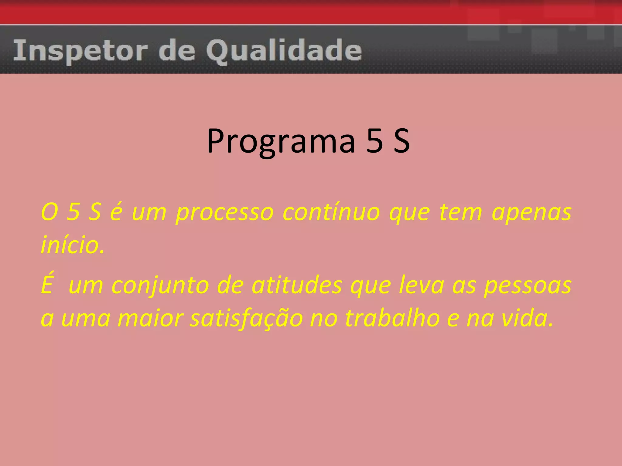 O documento descreve os 5S, um processo japonês para melhoria contínua da qualidade e produtividade no ambiente de trabalho. Os 5S incluem: SEIRI (organizar), SEITON (arrumar), SEISO (limpar), SEIKETSU (padronizar) e SHITSUKE (autodisciplina). A aplicação dos 5S promove um ambiente de trabalho mais agradável e seguro, além de reduzir custos e melhorar a satisfação dos funcionários.