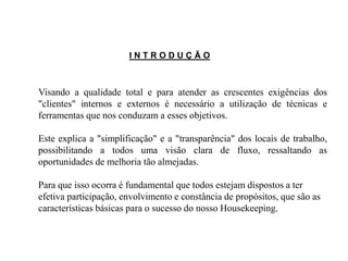 O documento discute o programa de gerenciamento 5S (Seiri, Seiton, Seiso, Seiketsu e Shitsuke) que visa organizar e manter o local de trabalho limpo e em ordem para melhorar a qualidade, produtividade e segurança. O 5S inclui organizar e descartar itens desnecessários, definir um lugar para cada item, limpar regularmente, manter hábitos de higiene pessoal e auto-disciplina.