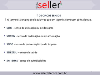 O documento descreve os cinco sentidos (5S) da técnica japonesa de organização e limpeza. Os 5S são: Seiri (separar), Seiton (ordenar), Seiso (limpar), Seiketsu (padronizar) e Shitsuke (disciplina). O objetivo é melhorar a qualidade de vida das pessoas por meio da redução de desperdícios, custos e aumento da produtividade.