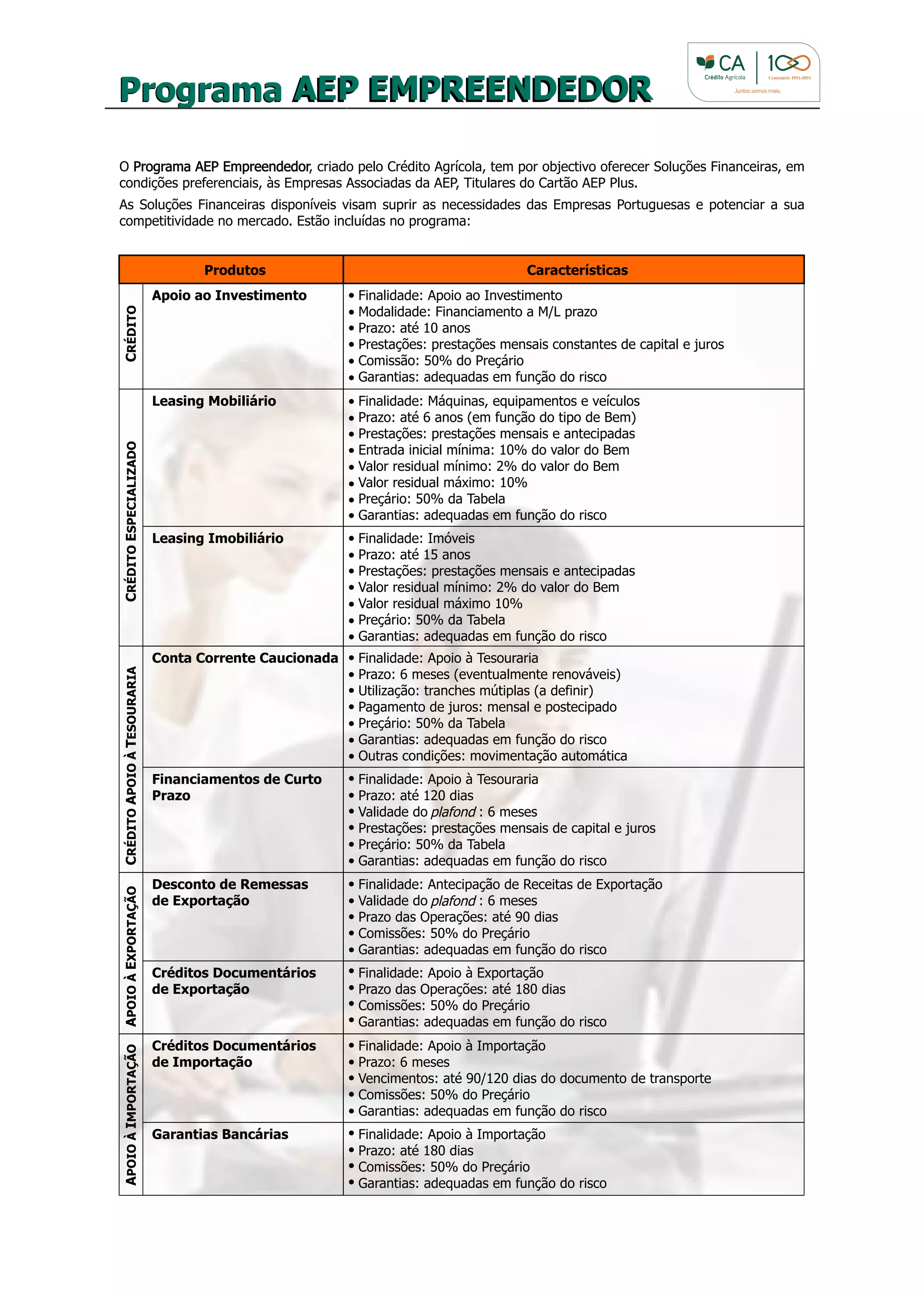 O documento descreve o Programa AEP Empreendedor do Crédito Agrícola, que oferece soluções financeiras em condições preferenciais para empresas associadas da AEP. O programa inclui produtos de crédito como apoio ao investimento, leasing mobiliário e imobiliário, e apoio à tesouraria, além de serviços adicionais como cartões e seguros. Contatos para mais informações são fornecidos.