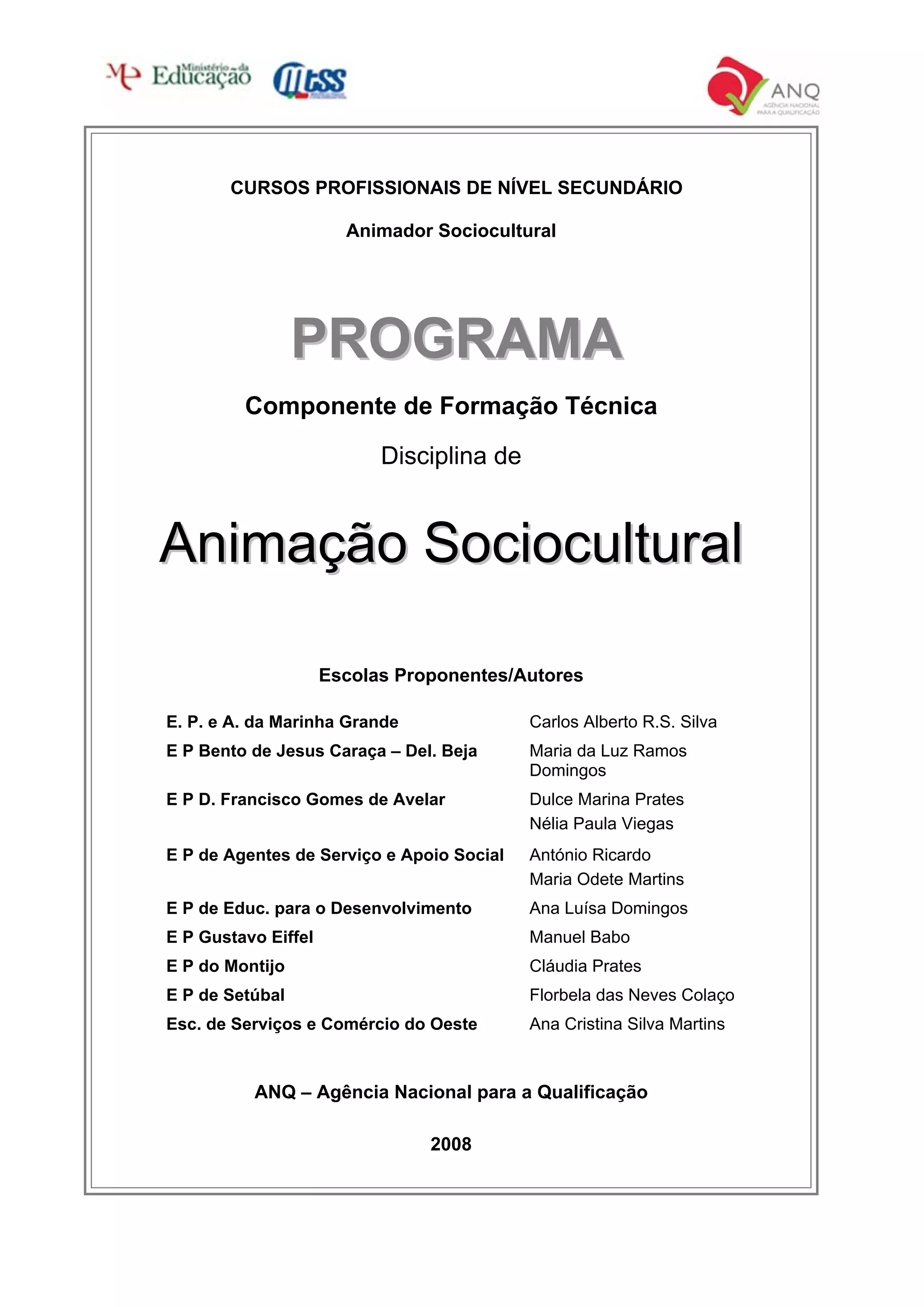 Este documento apresenta o programa da disciplina de Animação Sociocultural para cursos profissionais de nível secundário. Em 3 frases ou menos: