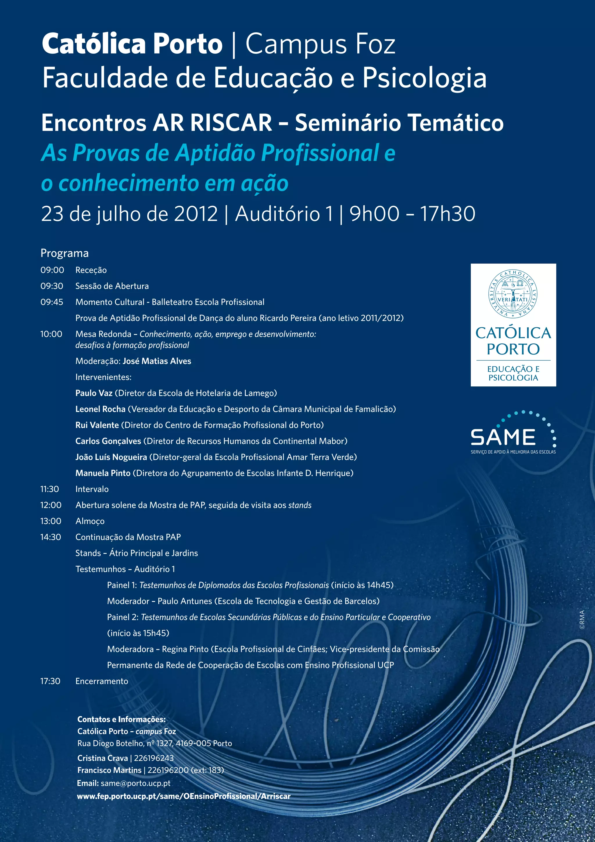 O documento descreve o programa de um seminário sobre as Provas de Aptidão Profissional realizado na Faculdade de Educação e Psicologia da Católica Porto. O programa inclui uma sessão de abertura, uma mesa redonda sobre formação profissional com vários especialistas, uma mostra de Provas de Aptidão Profissional com testemunhos de alunos e escolas, e um encerramento.
