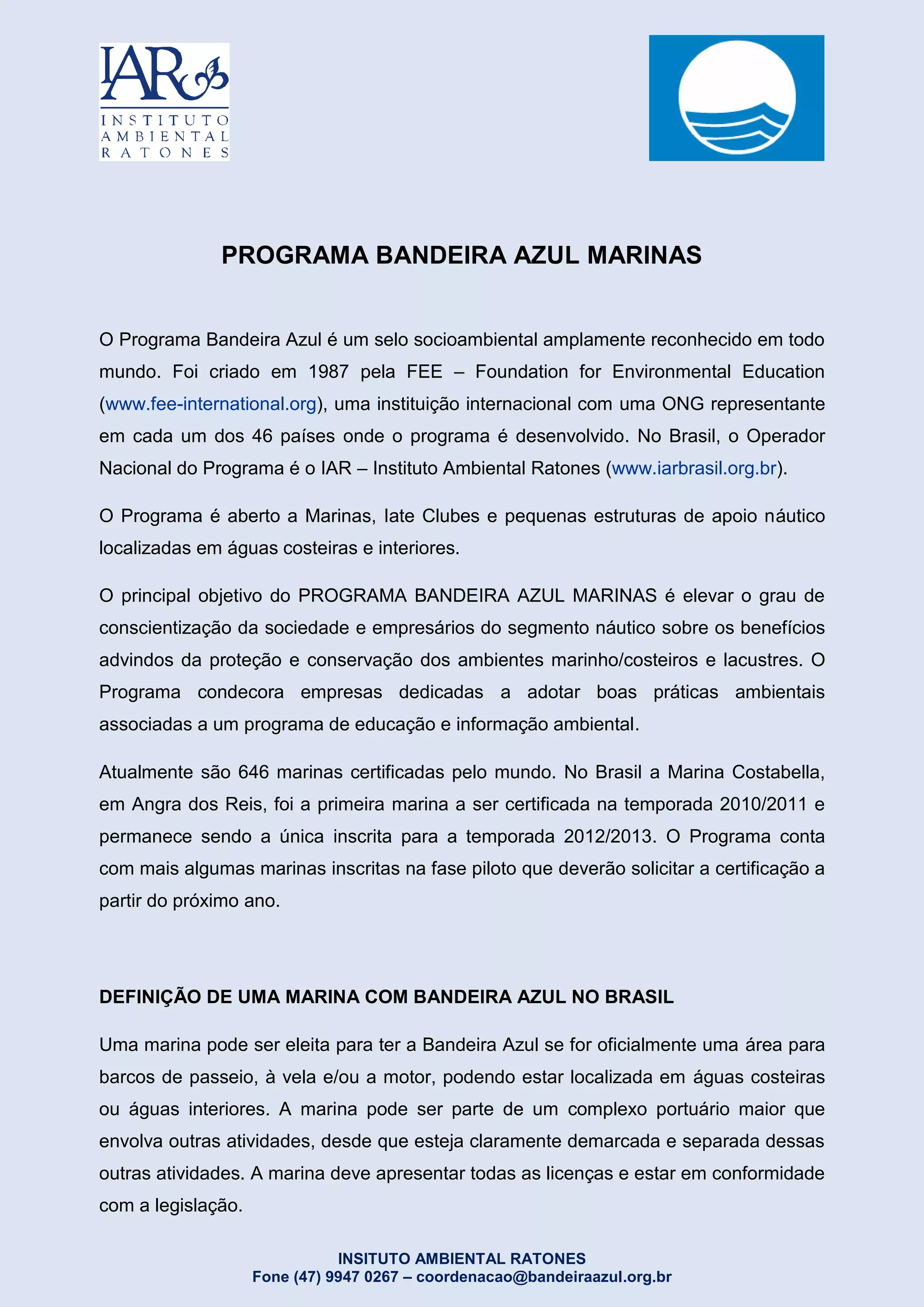 O Programa Bandeira Azul concede um selo ambiental para marinas que adotam boas práticas ambientais e educação sobre a proteção dos ambientes marinhos e costeiros. A primeira marina certificada no Brasil foi a Costabella em 2010. O programa busca conscientizar sobre a importância da conservação dos ambientes aquáticos.
