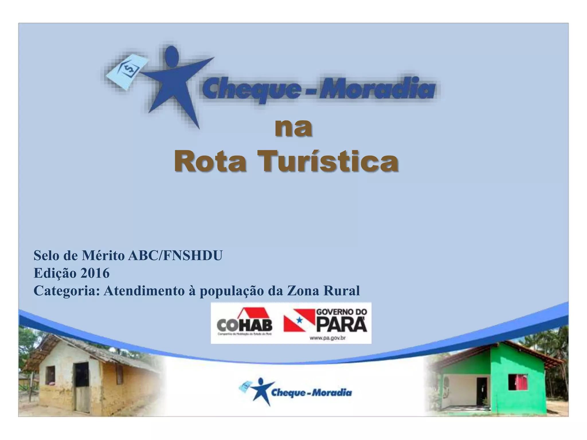 O documento descreve o programa Cheque Moradia, que visa atender famílias em vulnerabilidade social na zona rural da rota turística Belém-Bragança, promovendo a construção de moradias dignas e o desenvolvimento socioeconômico da região. O projeto envolve o apoio interinstitucional e a colaboração de empresas privadas, com foco em 180 famílias em situação de moradia precária. As etapas de execução das obras foram detalhadas, assim como as lições aprendidas sobre a importância da participação da comunidade e da articulação entre diferentes setores.