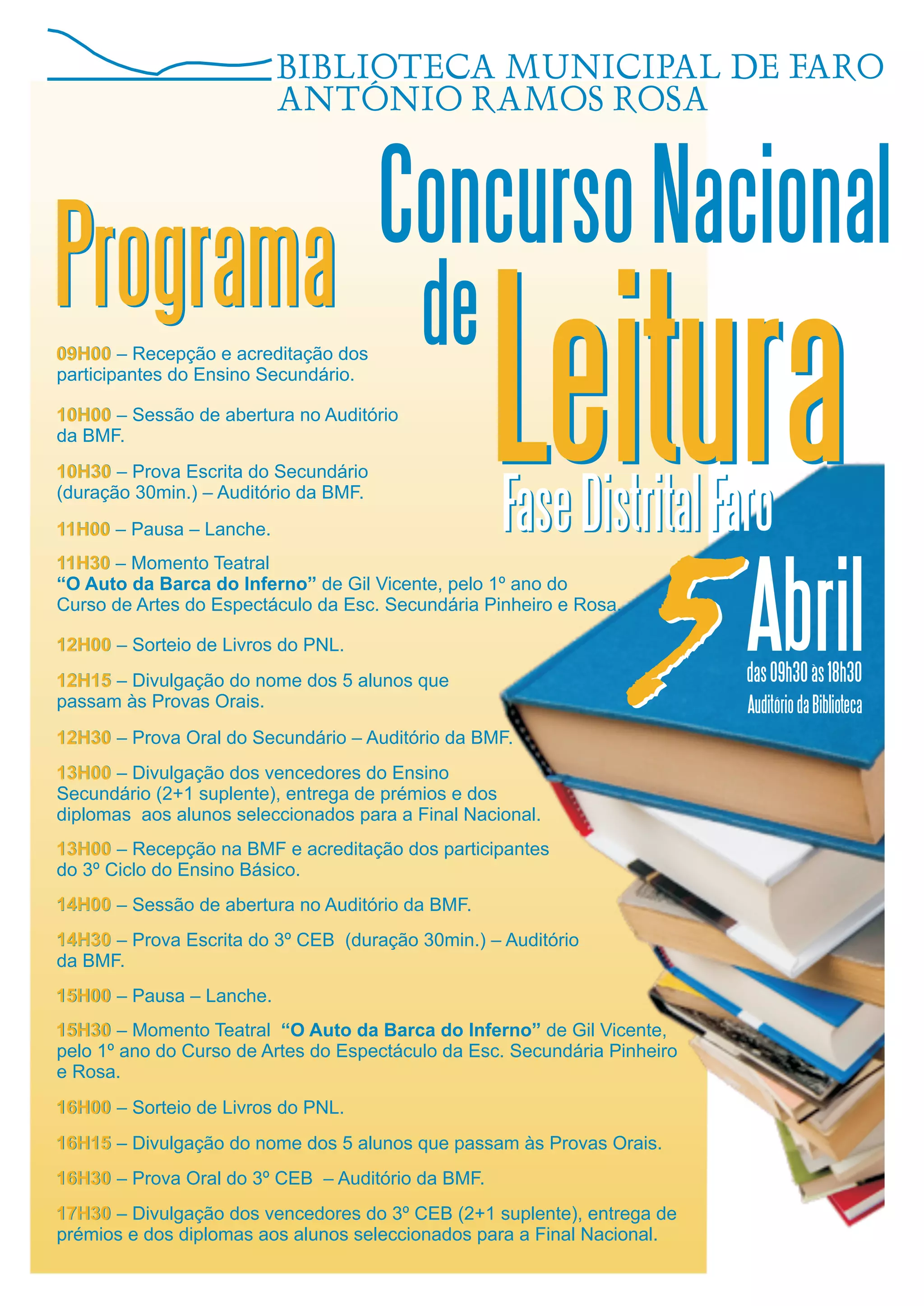 Este documento descreve o programa de um concurso nacional que inclui provas escritas e orais para alunos do ensino secundário e 3o ciclo do ensino básico. O programa inclui uma sessão de abertura, prova escrita, pausa para lanche, peça teatral, sorteio de livros, seleção de alunos para a prova oral e divulgação dos vencedores.