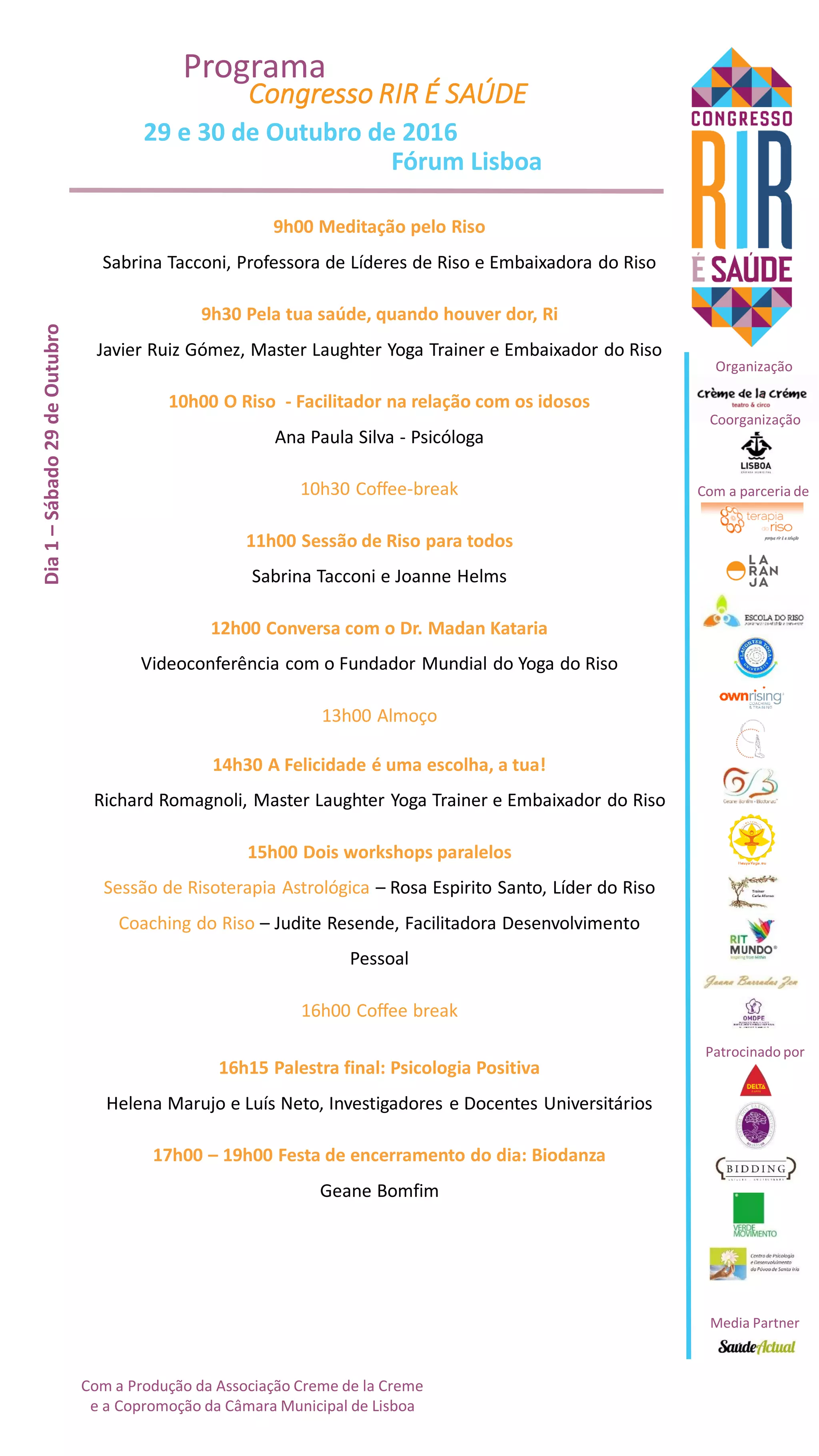 O Congresso Rir é Saúde, realizado em Lisboa nos dias 29 e 30 de outubro de 2016, incluiu diversas atividades como meditação pelo riso, palestras sobre a saúde mental e workshops de risoterapia. Participaram renomados palestrantes e especialistas na área, promovendo o riso como ferramenta para o bem-estar. O evento foi co-organizado pela Câmara Municipal de Lisboa e a associação Creme de la Creme.