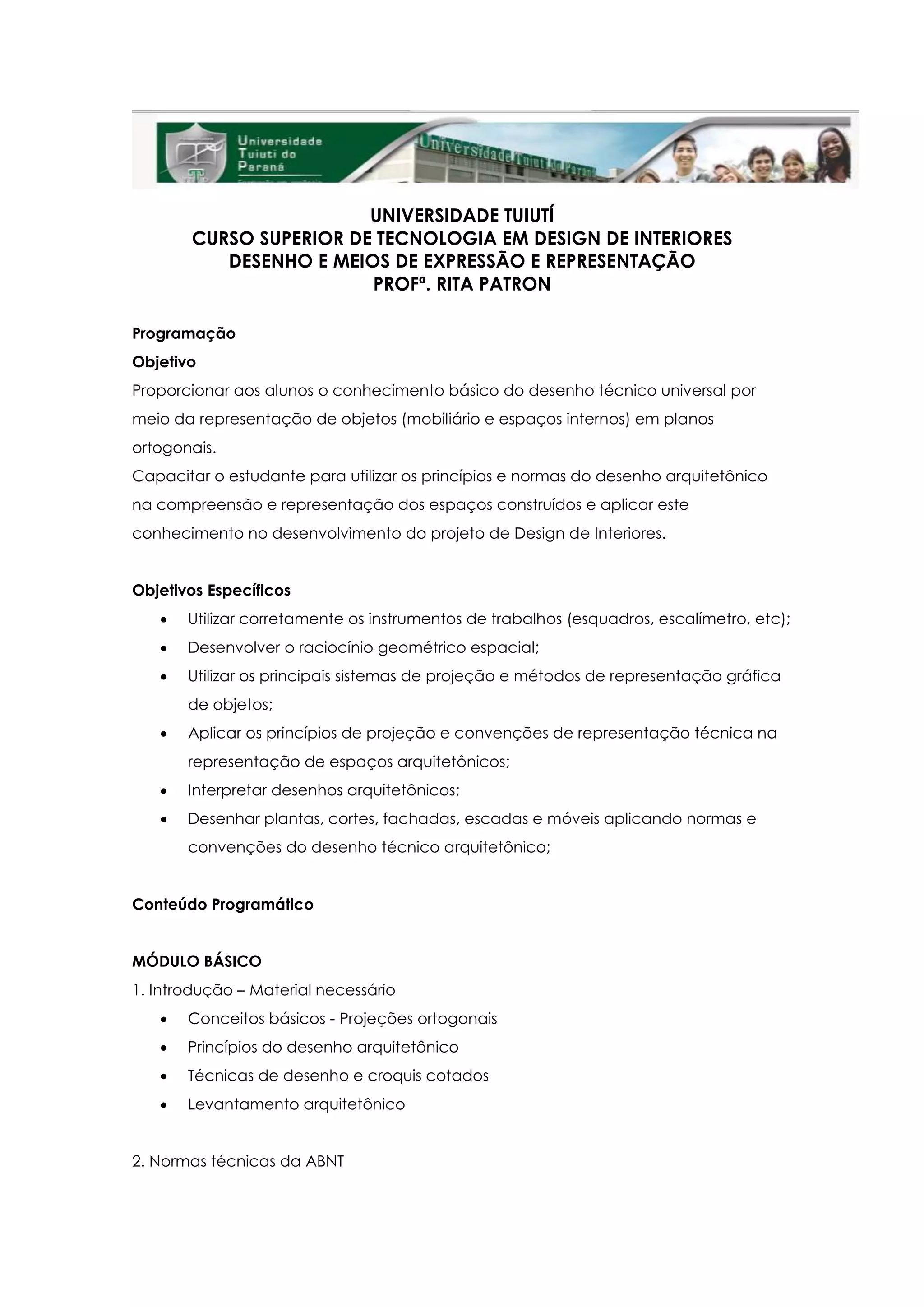 Este documento apresenta o programa de uma disciplina de Desenho e Meios de Expressão e Representação para o curso de Tecnologia em Design de Interiores da Universidade Tuiutí. O curso tem como objetivo ensinar os princípios básicos de desenho técnico e representação de espaços arquitetônicos para capacitar os alunos a projetar e desenvolver projetos de design de interiores. A disciplina abordará temas como sistemas de projeção, normas técnicas, plantas, cortes e desenho de mobiliário por me