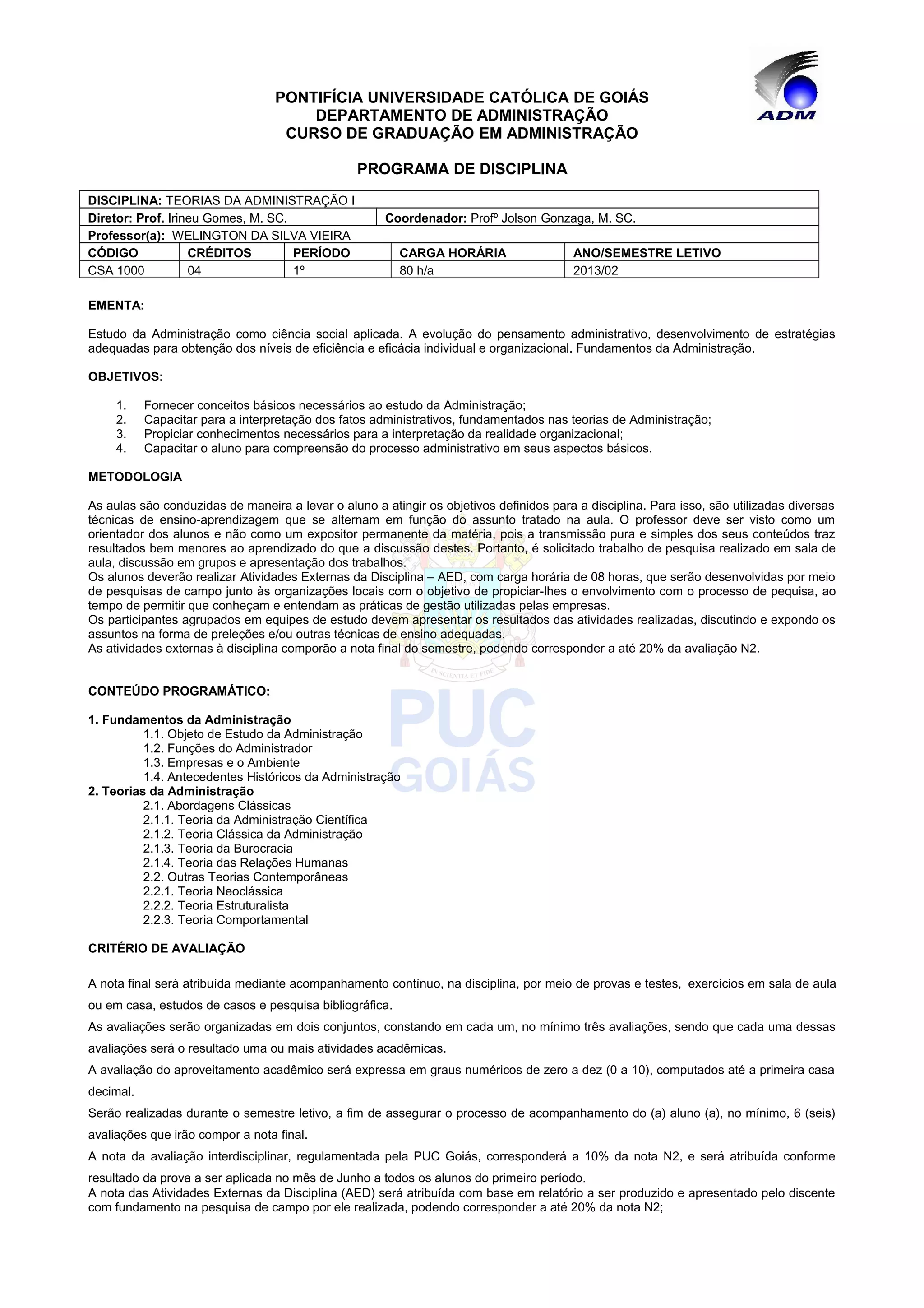 Este documento descreve uma disciplina de Teorias da Administração I lecionada na Pontifícia Universidade Católica de Goiás. A disciplina aborda os fundamentos da administração e as principais teorias clássicas e contemporâneas. Os alunos serão avaliados por meio de provas, trabalhos e uma pesquisa de campo, e a nota final será calculada a partir das médias das duas avaliações realizadas durante o semestre.