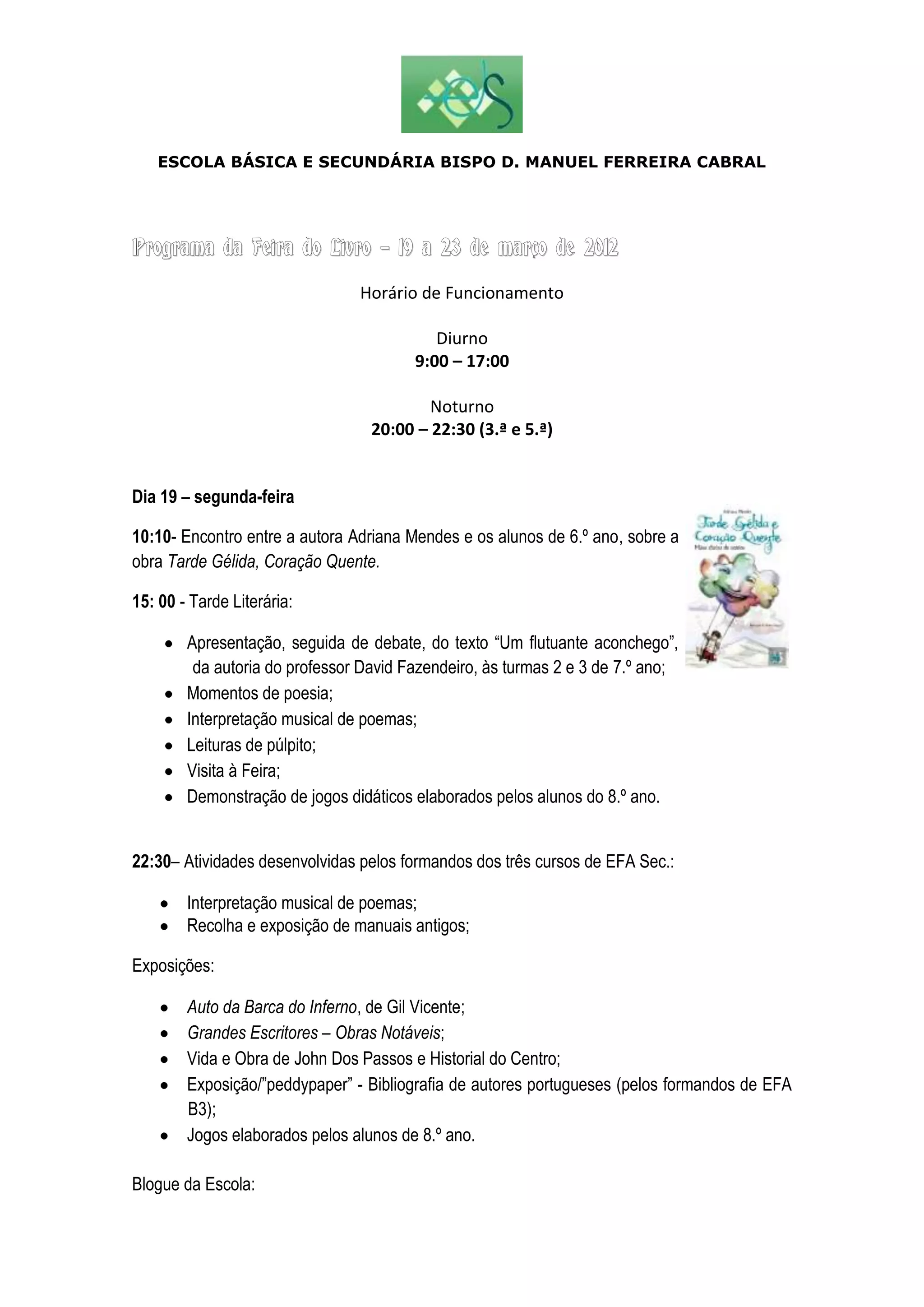 Este documento descreve o programa de atividades de uma feira do livro em uma escola básica e secundária portuguesa entre os dias 19 a 23 de março de 2012, incluindo encontros com autores, apresentações, debates, exibições de filmes e exposições sobre livros e autores.