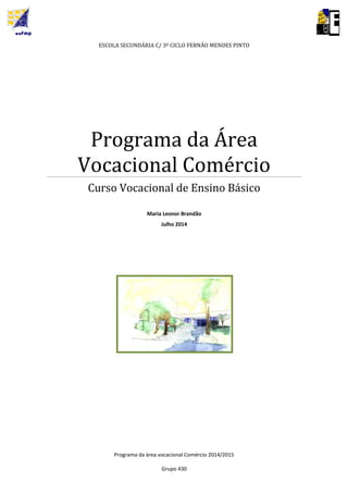 Este documento apresenta o programa da área vocacional de Comércio para o ano letivo de 2014/2015 de uma escola secundária. O programa destina-se a alunos com dificuldades de aprendizagem e pretende dotá-los de competências para o mercado de trabalho, como gestão de stocks, atendimento ao cliente e procedimentos administrativos. É constituído por 4 módulos focados em stocks, atendimento, pós-venda e documentação comercial.