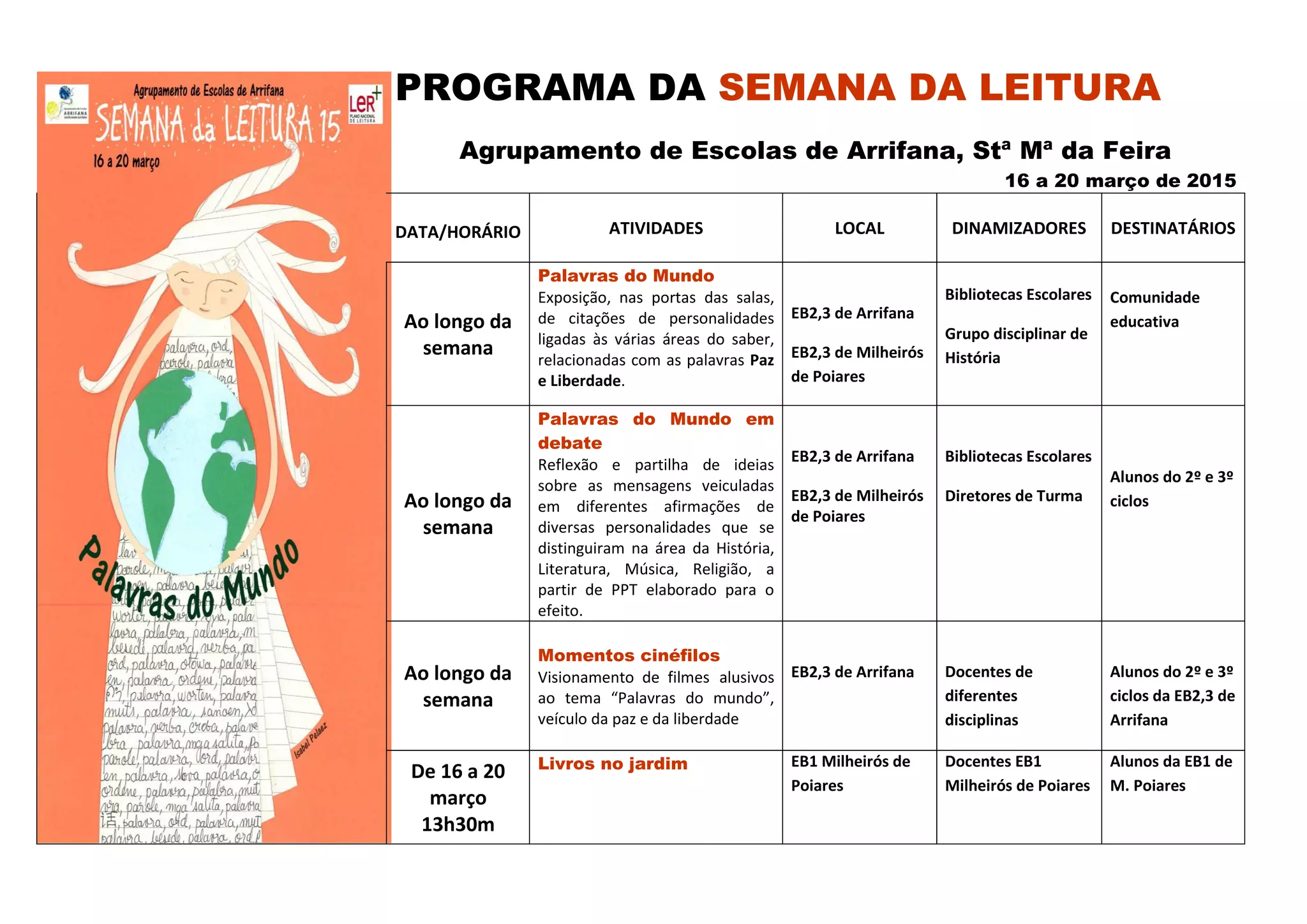 O documento apresenta o programa da Semana da Leitura do Agrupamento de Escolas de Arrifana, que decorrerá de 16 a 20 de março de 2015. O programa inclui várias atividades relacionadas com a leitura em escolas e jardins-de-infância da região, como exposições, debates, sessões de cinema, concursos de leitura e horas do conto. As atividades visam promover a reflexão sobre palavras-chave como paz e liberdade.