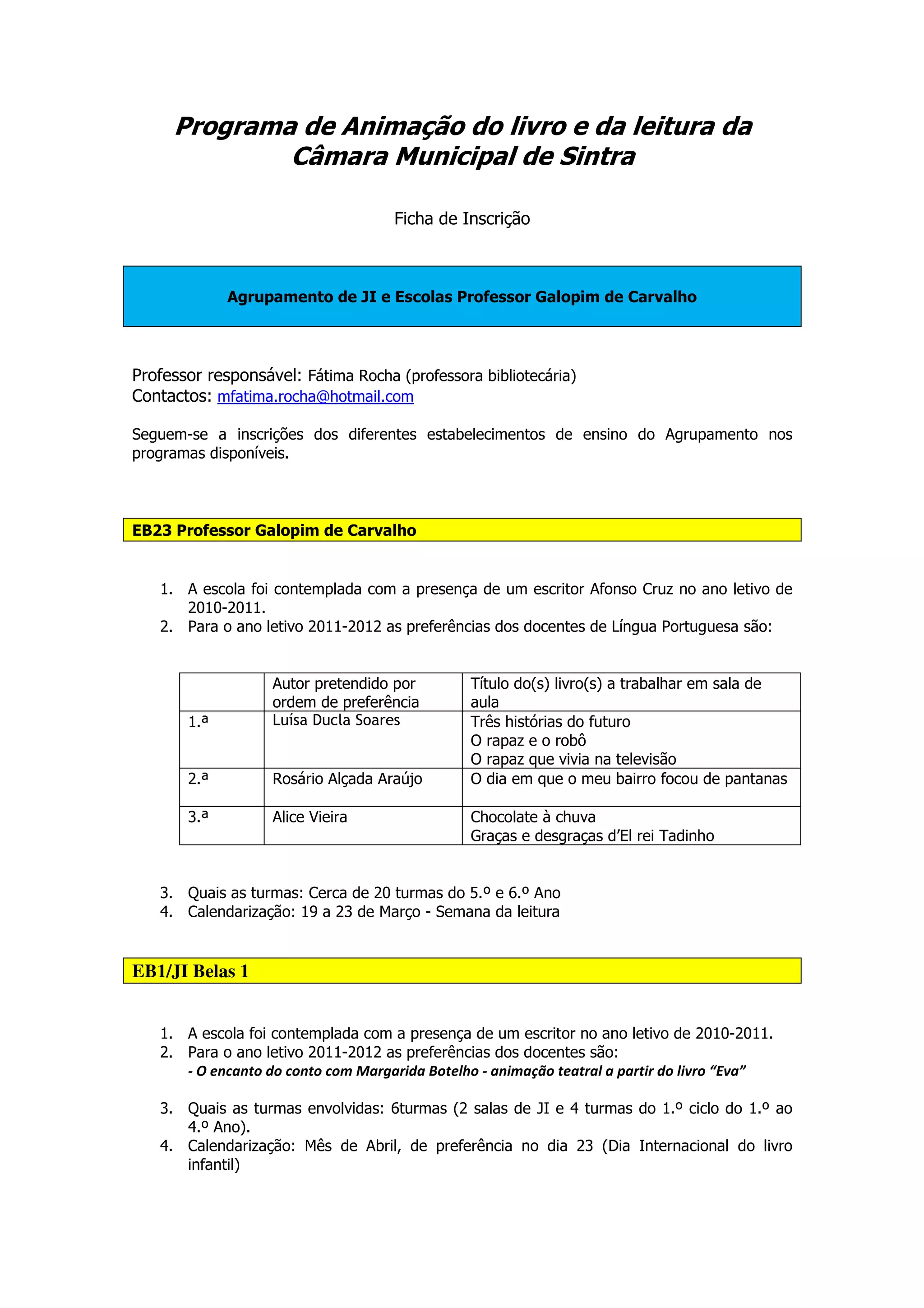 Este documento lista as preferências de vários estabelecimentos de ensino para programas de animação da leitura e do livro da Câmara Municipal de Sintra para o ano letivo de 2011-2012, incluindo autores e livros preferidos e datas propostas.