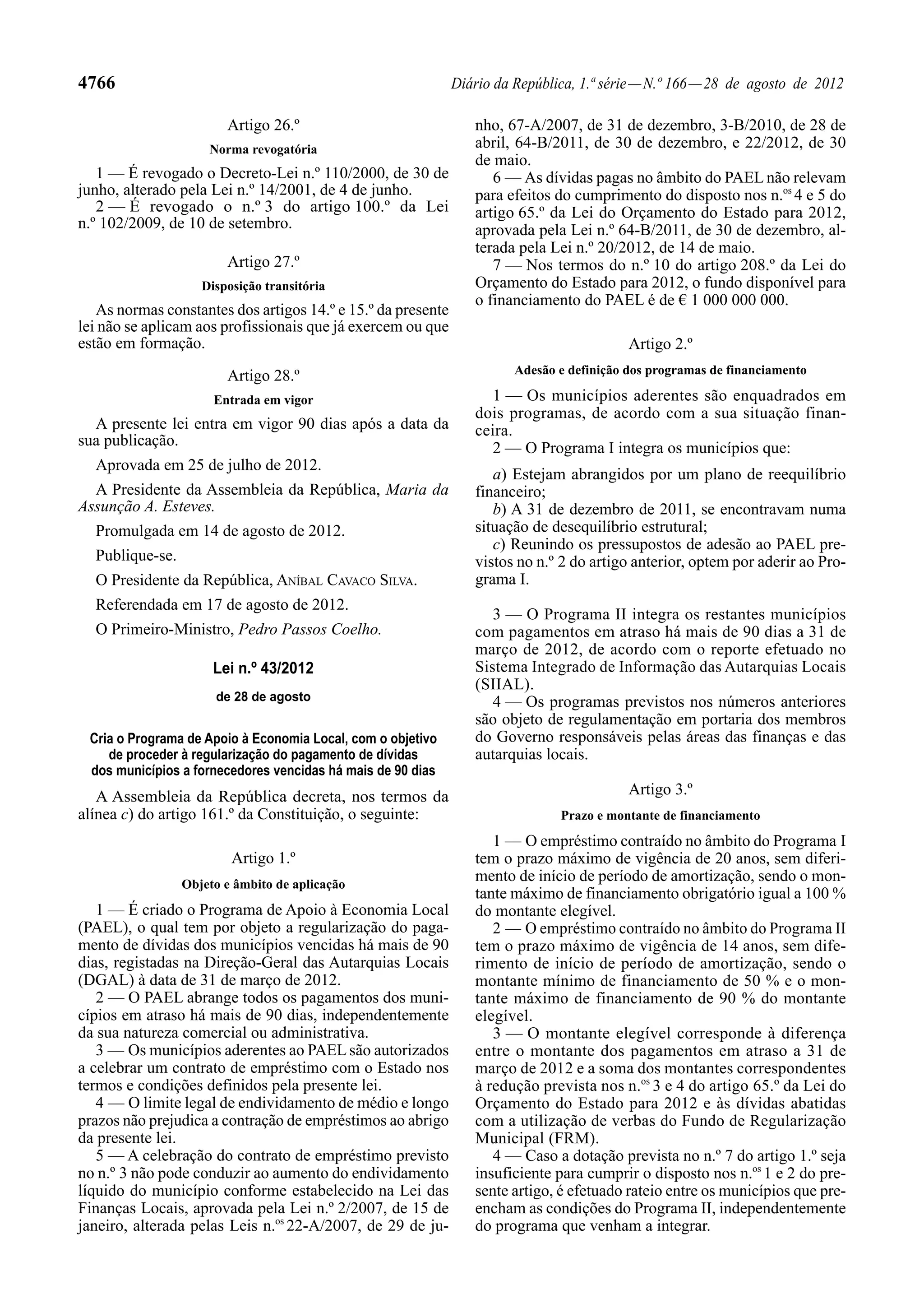Este documento estabelece o Programa de Apoio à Economia Local (PAEL) para regularizar pagamentos em atraso de municípios a fornecedores. Cria uma comissão para analisar os pedidos de financiamento e define dois programas com prazos e montantes de empréstimos diferentes consoante a situação financeira dos municípios. Estabelece também condições como a fixação de preços de serviços e objetivos de reequilíbrio financeiro que os municípios devem cumprir.