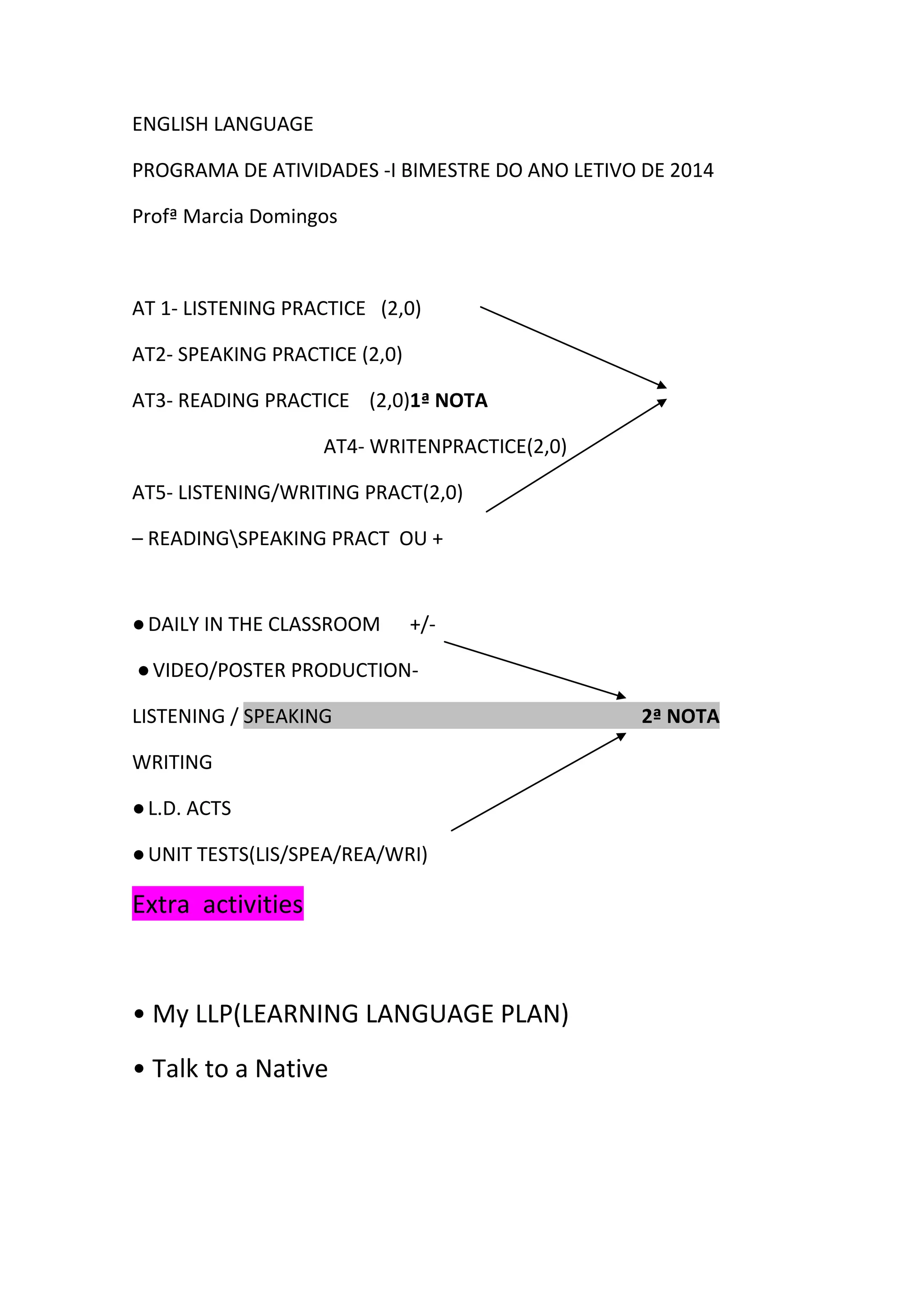 O documento apresenta o programa de atividades para o primeiro bimestre de 2014 para a disciplina de Inglês. Inclui cinco atividades de listening, speaking, reading e writing e avaliações. Também fornece sugestões para que os alunos completem seu My LLP (Plano de Aprendizagem da Língua) com atividades extraclasse como assistir filmes em inglês.