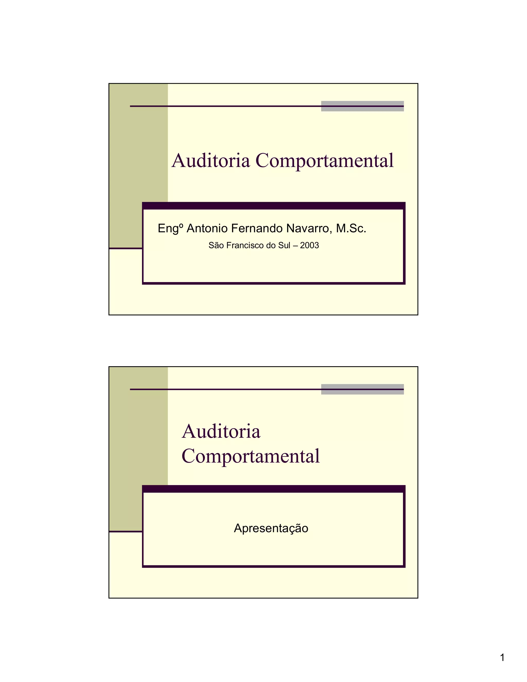 Este documento discute a auditoria comportamental, que analisa o comportamento de indivíduos para detectar situações de risco. A auditoria comportamental também é conhecida como auditoria baseada em atitudes. Ela observa fatores como a reação das pessoas, sua posição, o uso de equipamentos de proteção individual, ferramentas, procedimentos, ordem e limpeza. O objetivo é identificar desvios de comportamento que possam levar a acidentes ou melhorar o sistema de gestão.