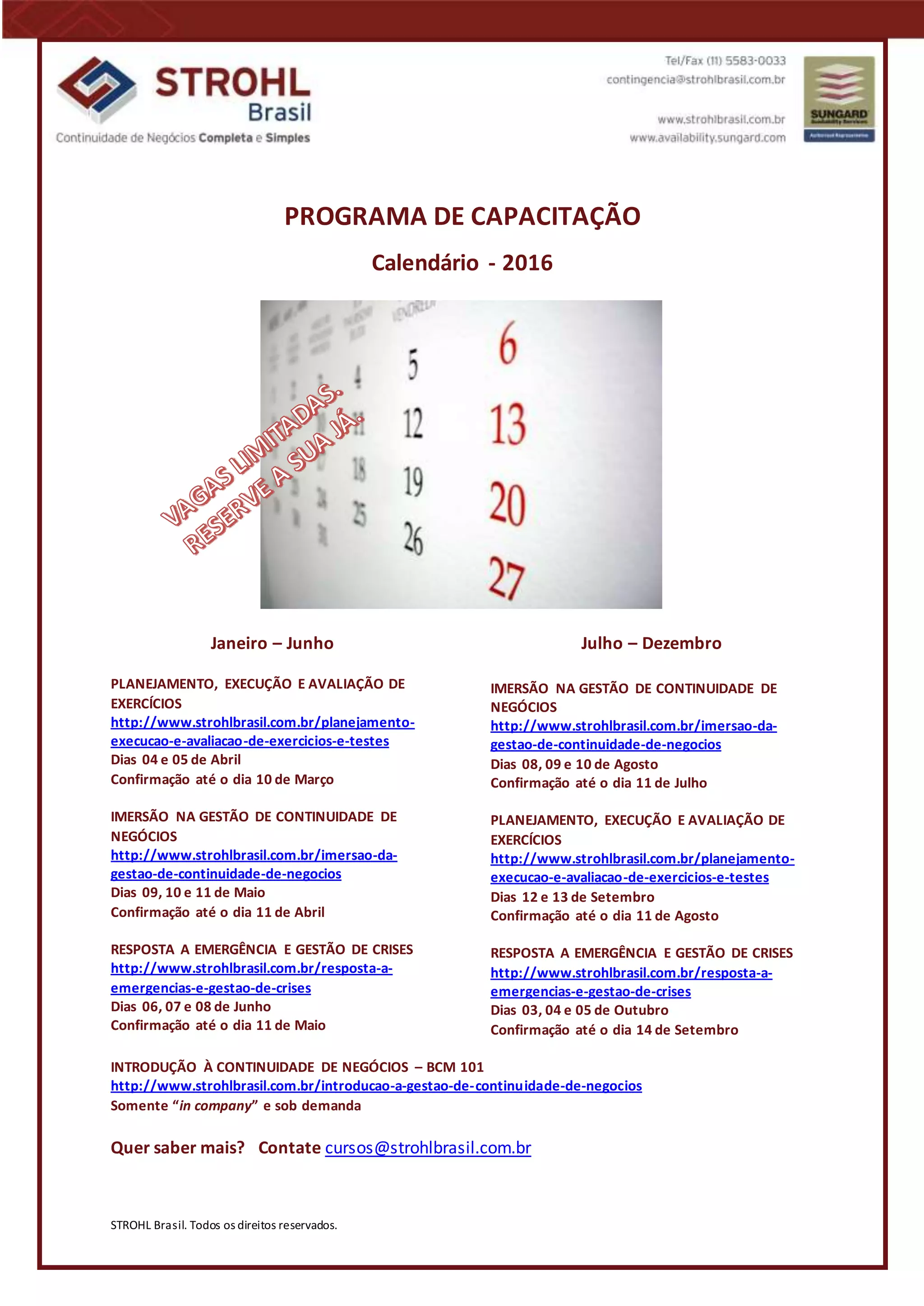 O documento apresenta o calendário de capacitação da empresa Strohl Brasil para 2016, com cursos sobre planejamento e avaliação de exercícios, gestão de continuidade de negócios, resposta a emergências e gestões de crises a serem realizados entre janeiro e dezembro, com datas e links para mais informações sobre cada curso.