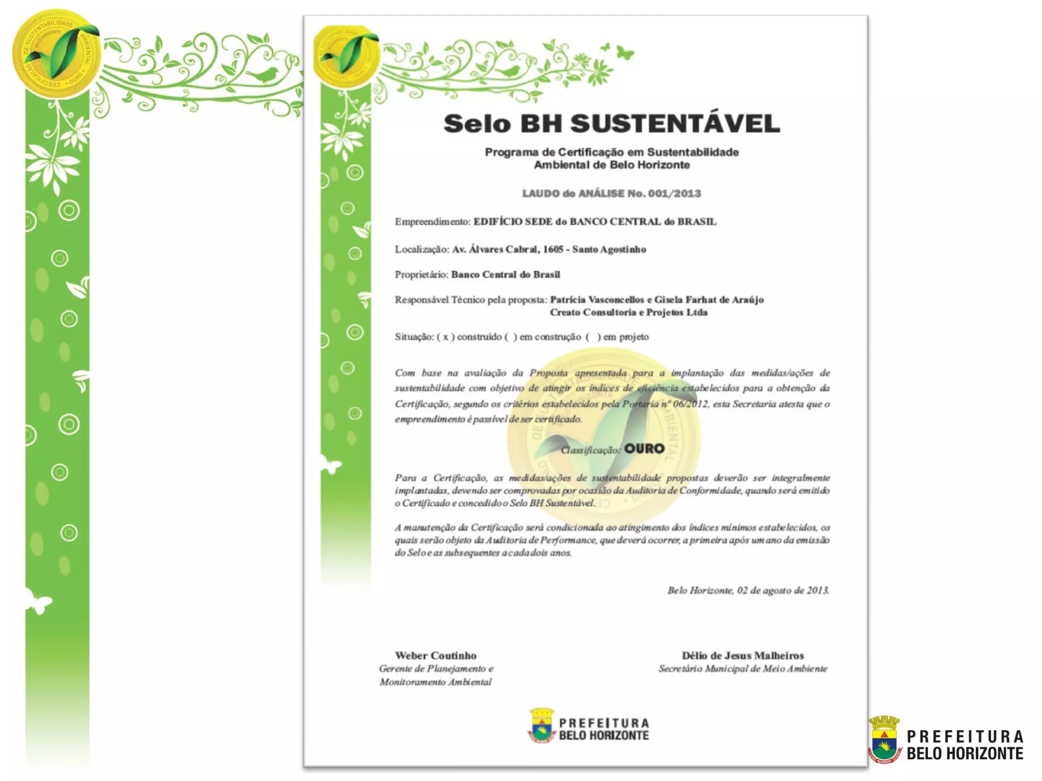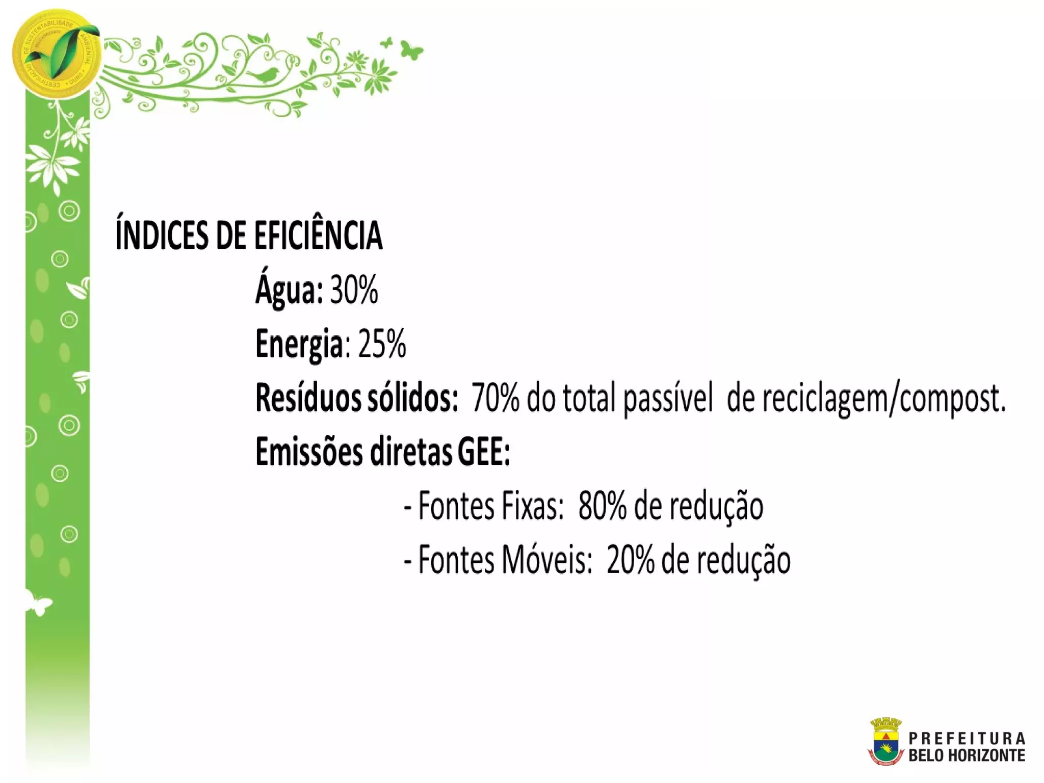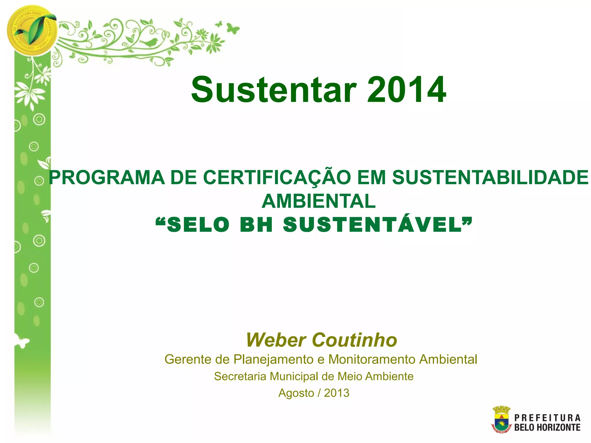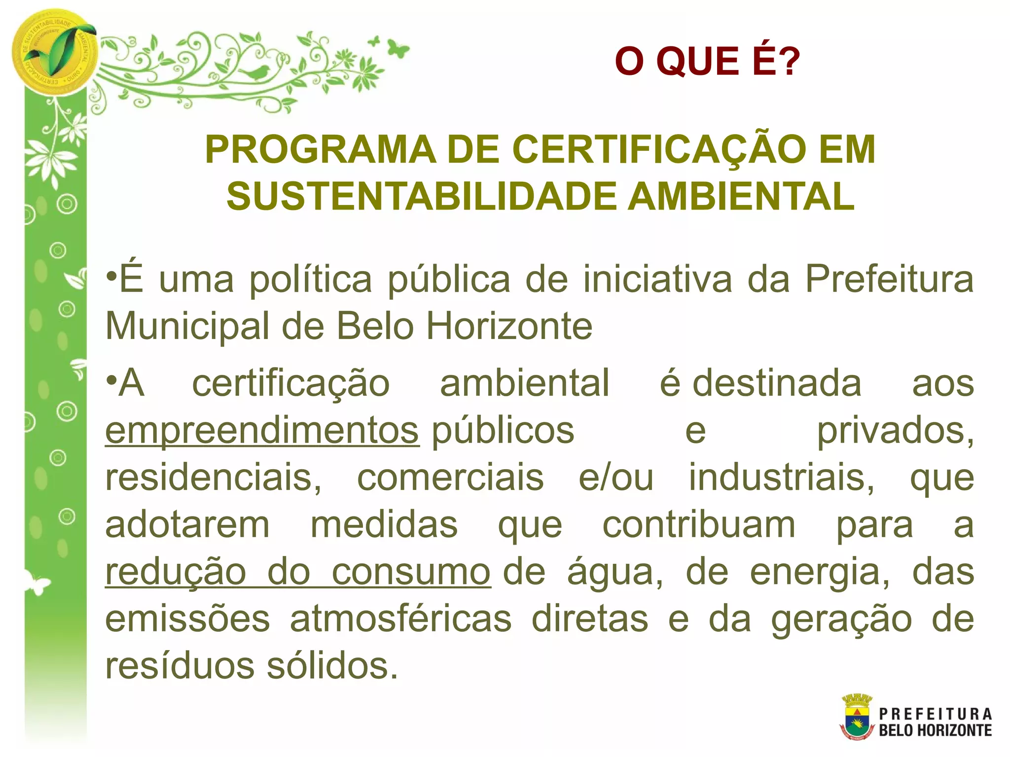 O documento descreve um programa de certificação ambiental em Belo Horizonte que oferece selos de bronze, prata e ouro para empreendimentos públicos e privados que adotem medidas sustentáveis. O objetivo é reduzir emissões de gases de efeito estufa, incentivar a construção sustentável, melhorar a qualidade do ar e influenciar a formação profissional. O programa avalia setores como agropecuária, indústria, serviços, construção civil e eventos.